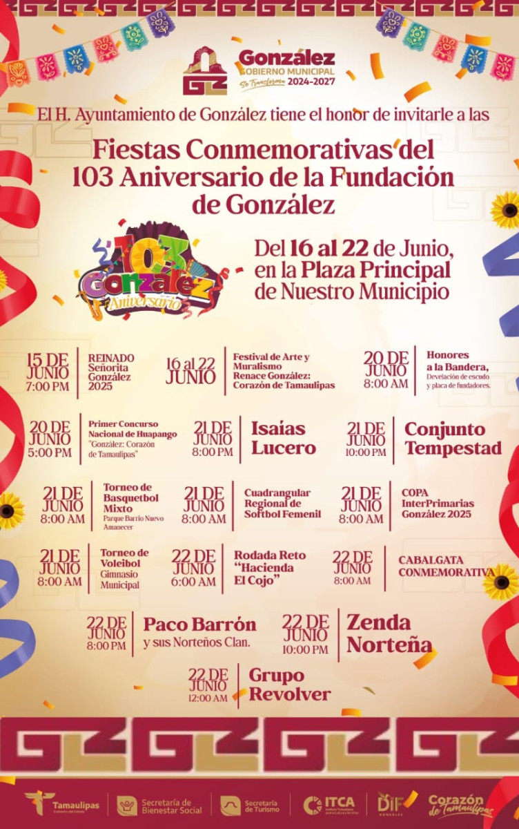 El Gobierno Municipal de González, Tamaulipas, se prepara para su más grande celebración del año, vistiendo de gala para conmemorar el 103 Aniversario de su Fundación con una semana completa de fiestas, música y tradición.