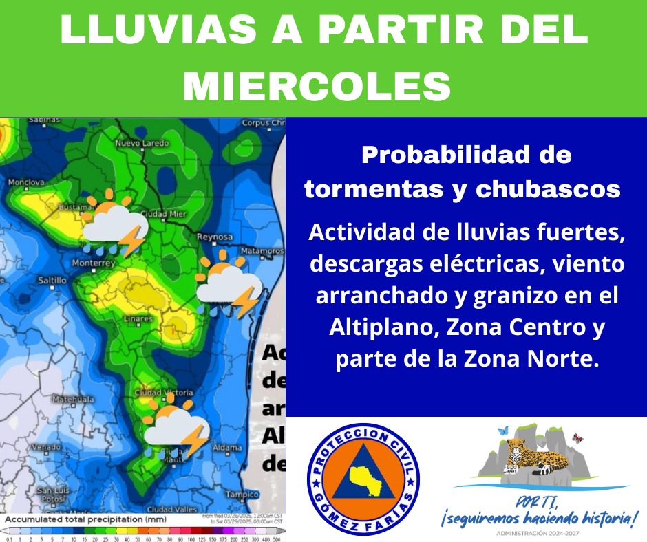 La Coordiación Estatal de Protección Civil en su boletín semanal expresa y anuncia lluvias para el fin de mes e inicio de Mayo, en la temporada considerada de humedad para esta zona de Tamaulipas.