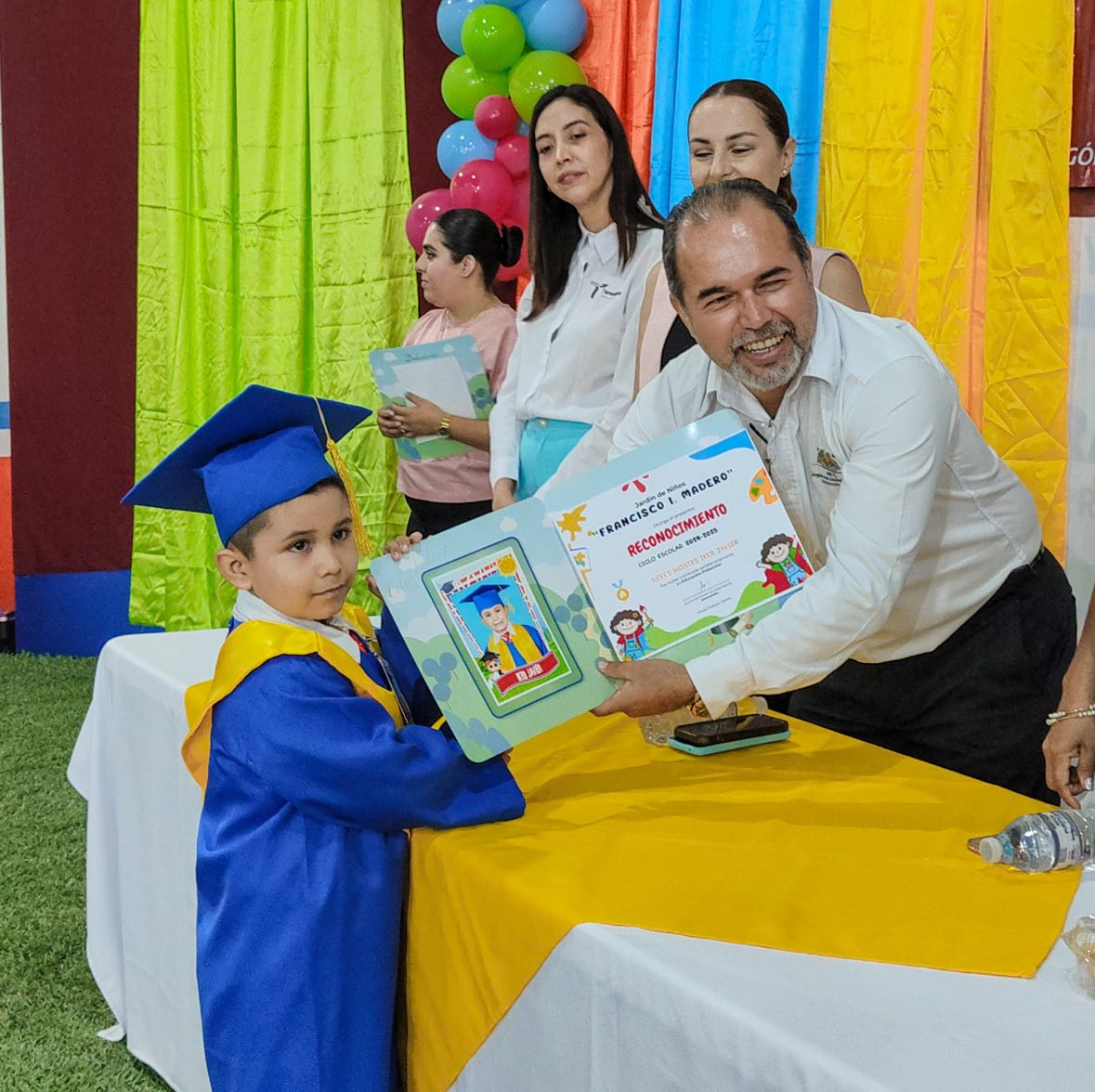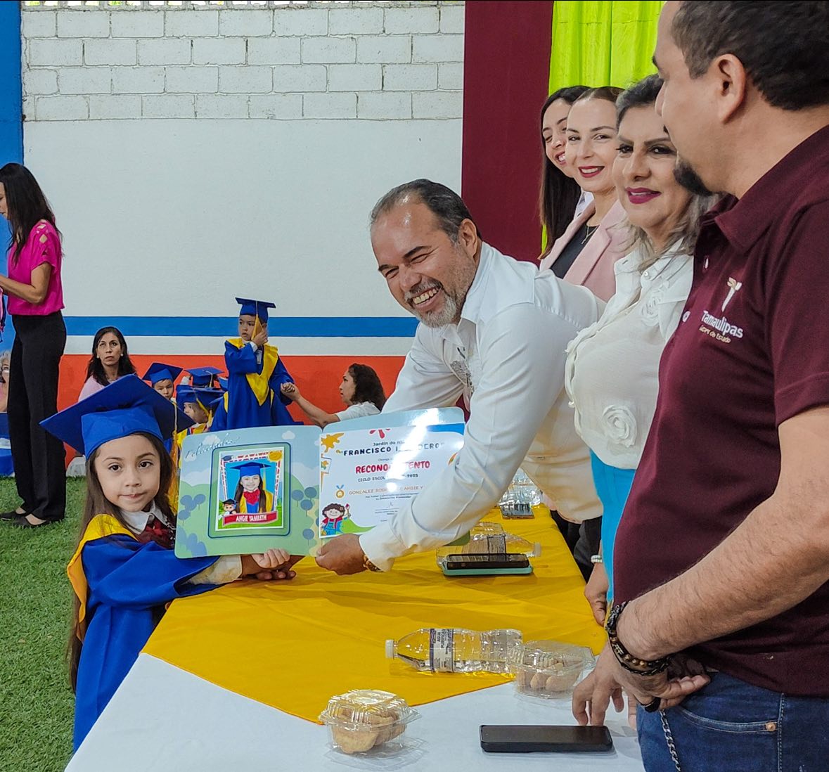 Acompañado por su esposa, Alejandra Garza Pacheco, el alcalde asistió al auditorio municipal, donde se llevó a cabo la ceremonia de graduación y entrega de documentos que certifican la conclusión de los estudios de preescolar.