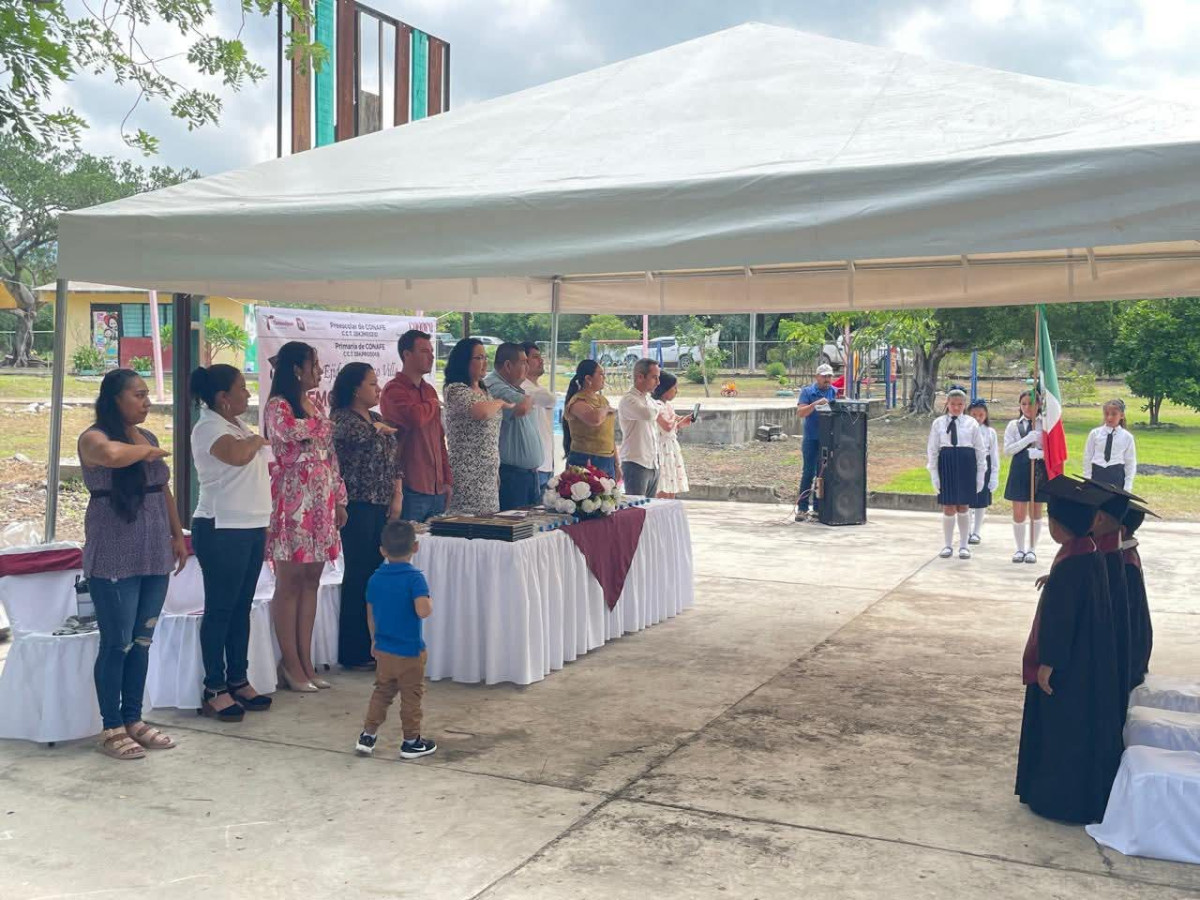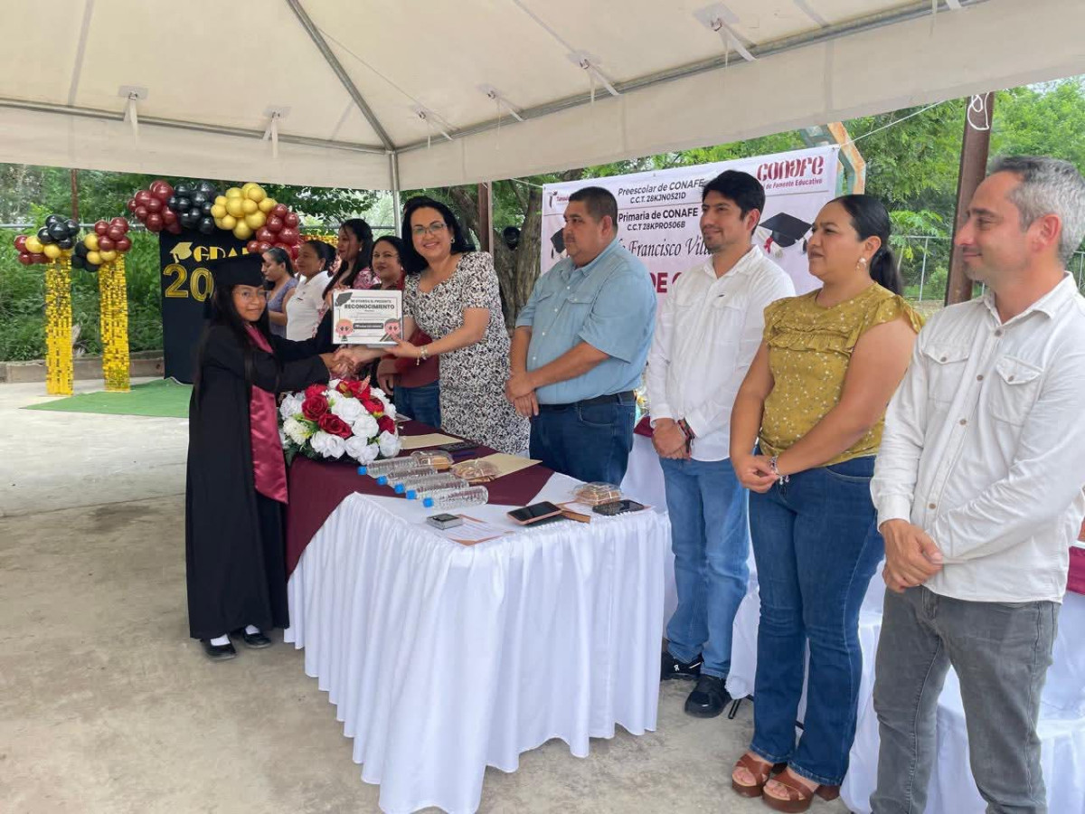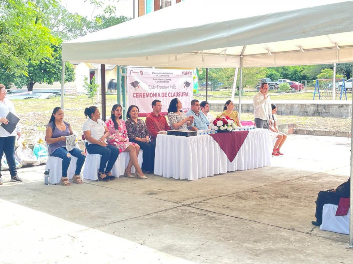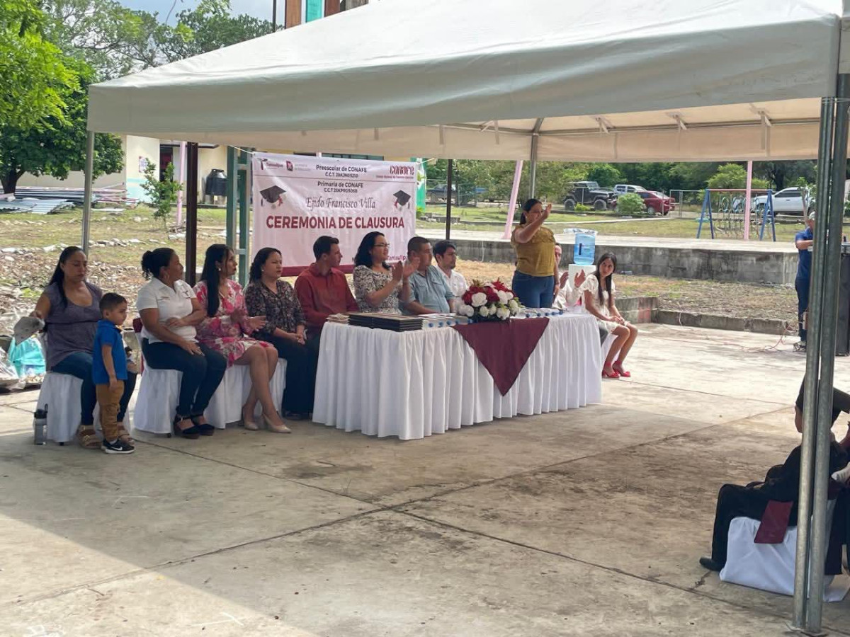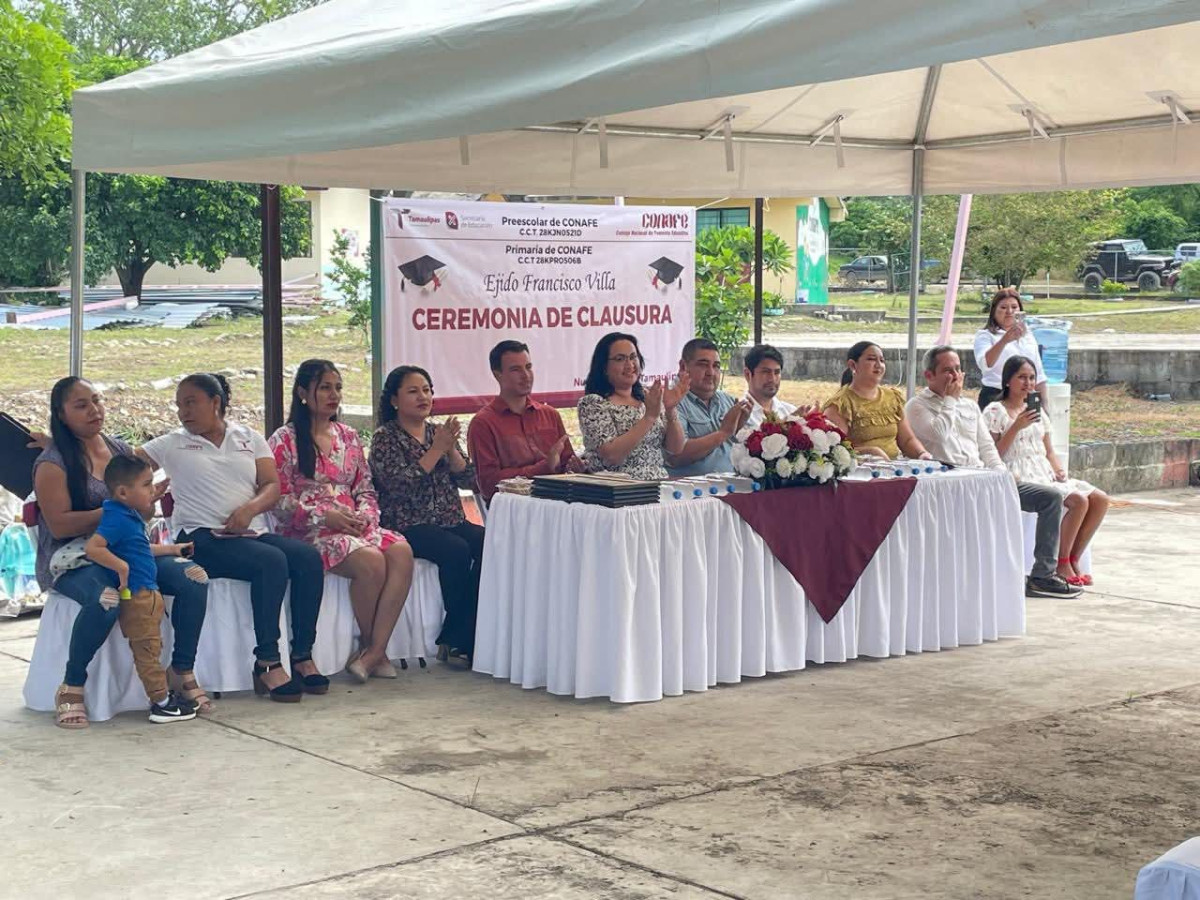 Nuevo Morelos,Tam.-Este día, el Ejido Francisco Villa fue escenario de una emotiva ceremonia de clausura del ciclo escolar de Preescolar y Primaria CONAFE, en la que niñas y niños celebraron el cierre de una importante etapa educativa.
