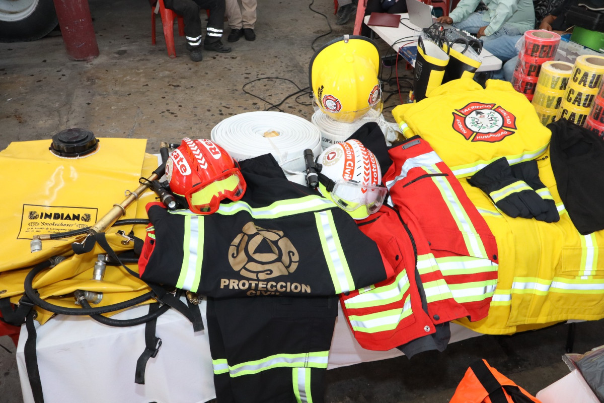 Reunidos en la base 1 de bomberos, la Presidenta Municipal Patty Chío acompañada por integrantes del cabildo y el Director de Protección Civil, Edgar Ayala Calderón, hicieron entrega de : cascos de bomberos ,mangueras , vehículo de respuesta inmediata, cascos de rescate , mochilas aspersoras para incendio forestal , uniformes operativos, motosierras y escaleras .