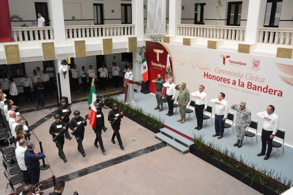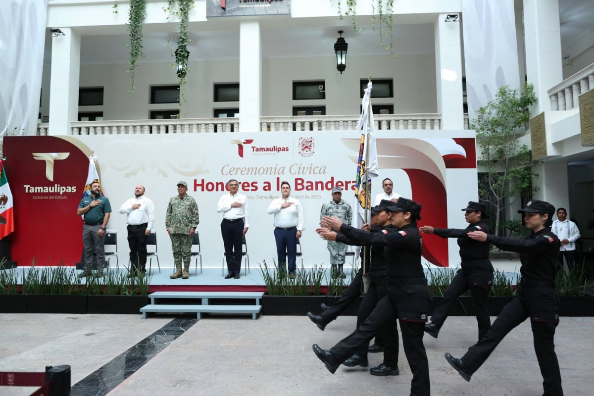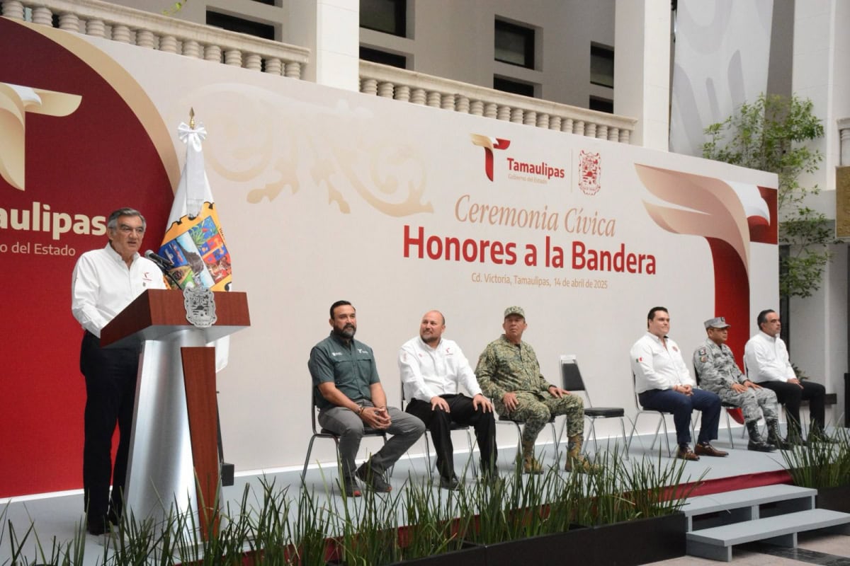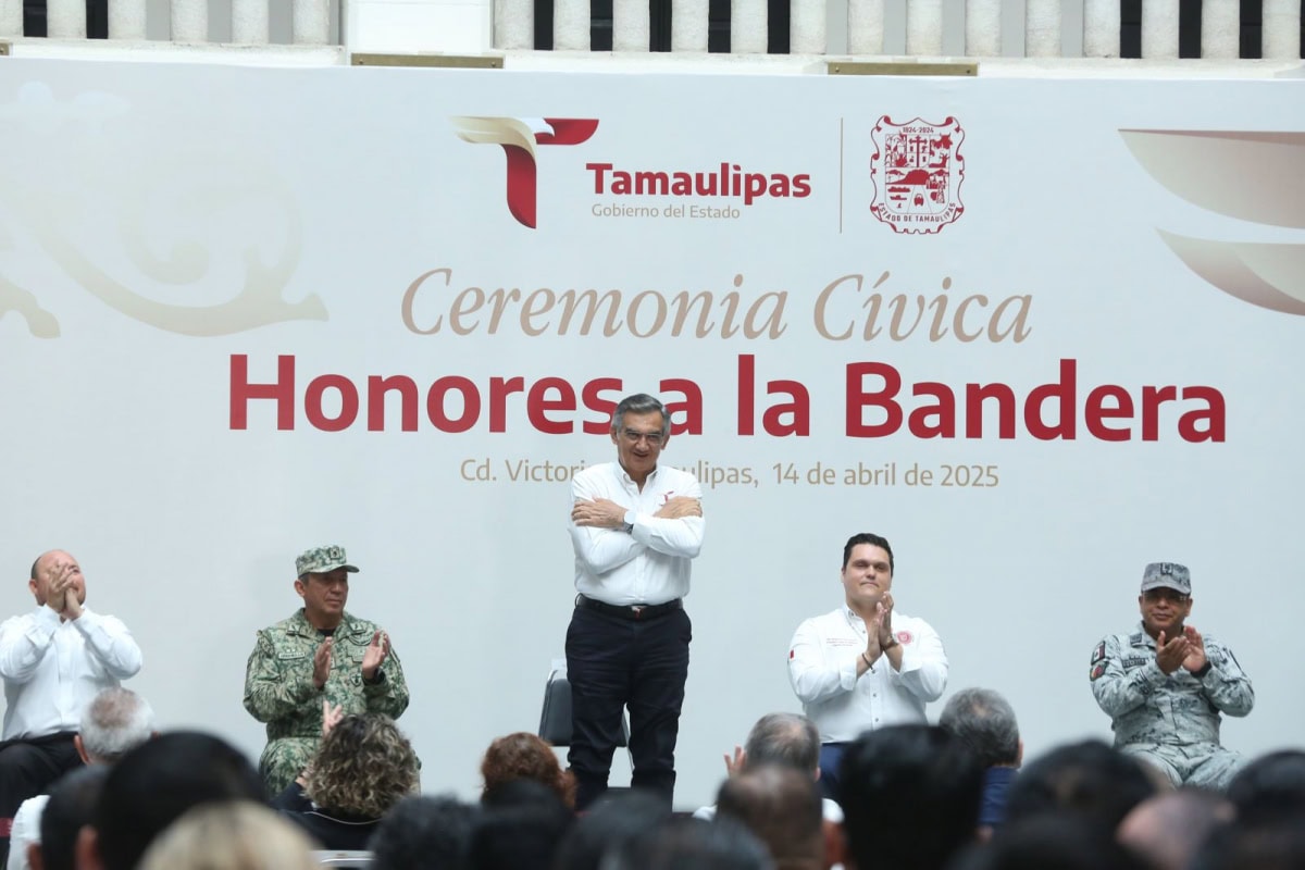 Al presidir la ceremonia cívica de honores a la bandera este lunes, en la explanada interior del Palacio de Gobierno, acompañado por los titulares de los Poderes Legislativo y Judicial, el gobernador destacó que Tamaulipas sigue adelante, contando en todo momento con el gran respaldo de la presidenta de México, Claudia Sheinbaum Pardo.