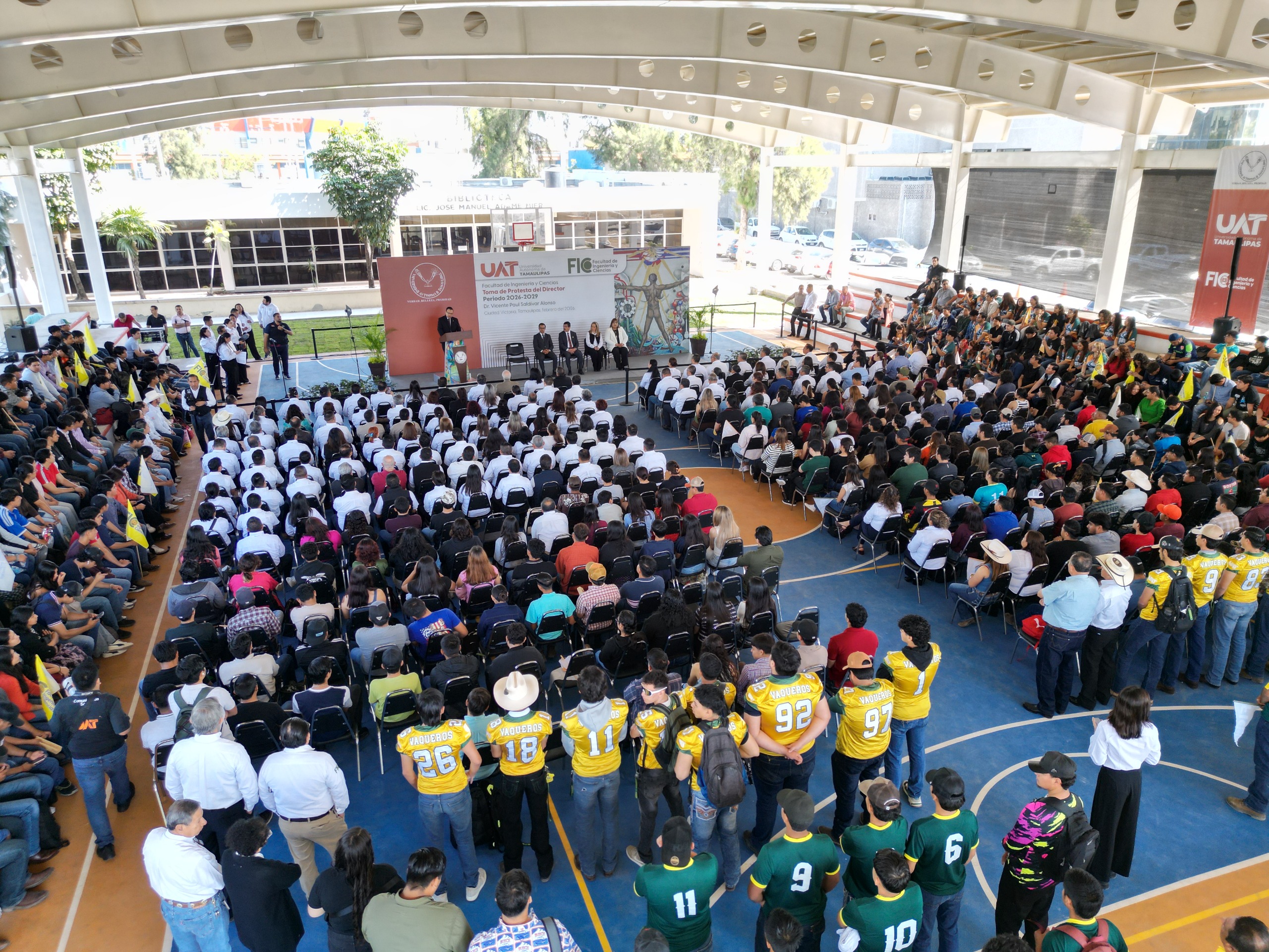En una gira de trabajo por la Facultad de Ingeniería y Ciencias (FIC), el rector de la Universidad Autónoma de Tamaulipas (UAT), Dámaso Anaya Alvarado, inauguró la techumbre de la cancha de usos múltiples; a la vez que oficializó el inicio de la gestión del Dr. Vicente Paul Saldívar Alonso como director del plantel para el periodo 2026-2029.