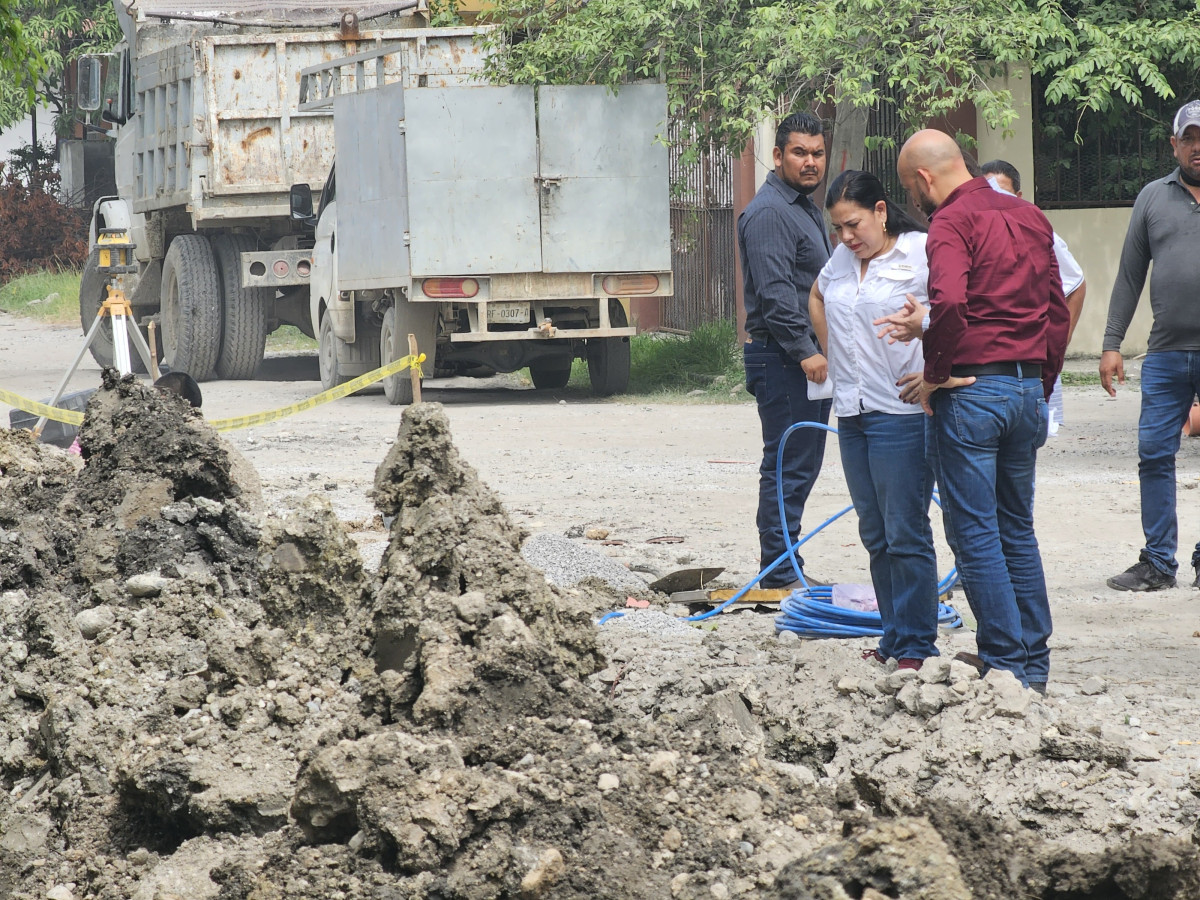 - En la calle Refinería, la Presidenta Municipal supervisó los trabajos para la sustitución en la red de drenaje sanitario y tomas de agua.