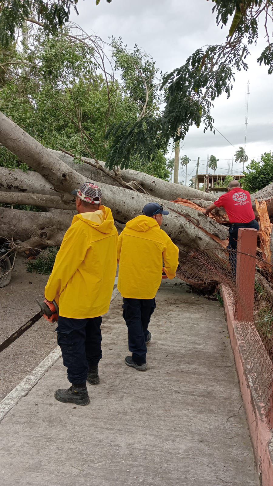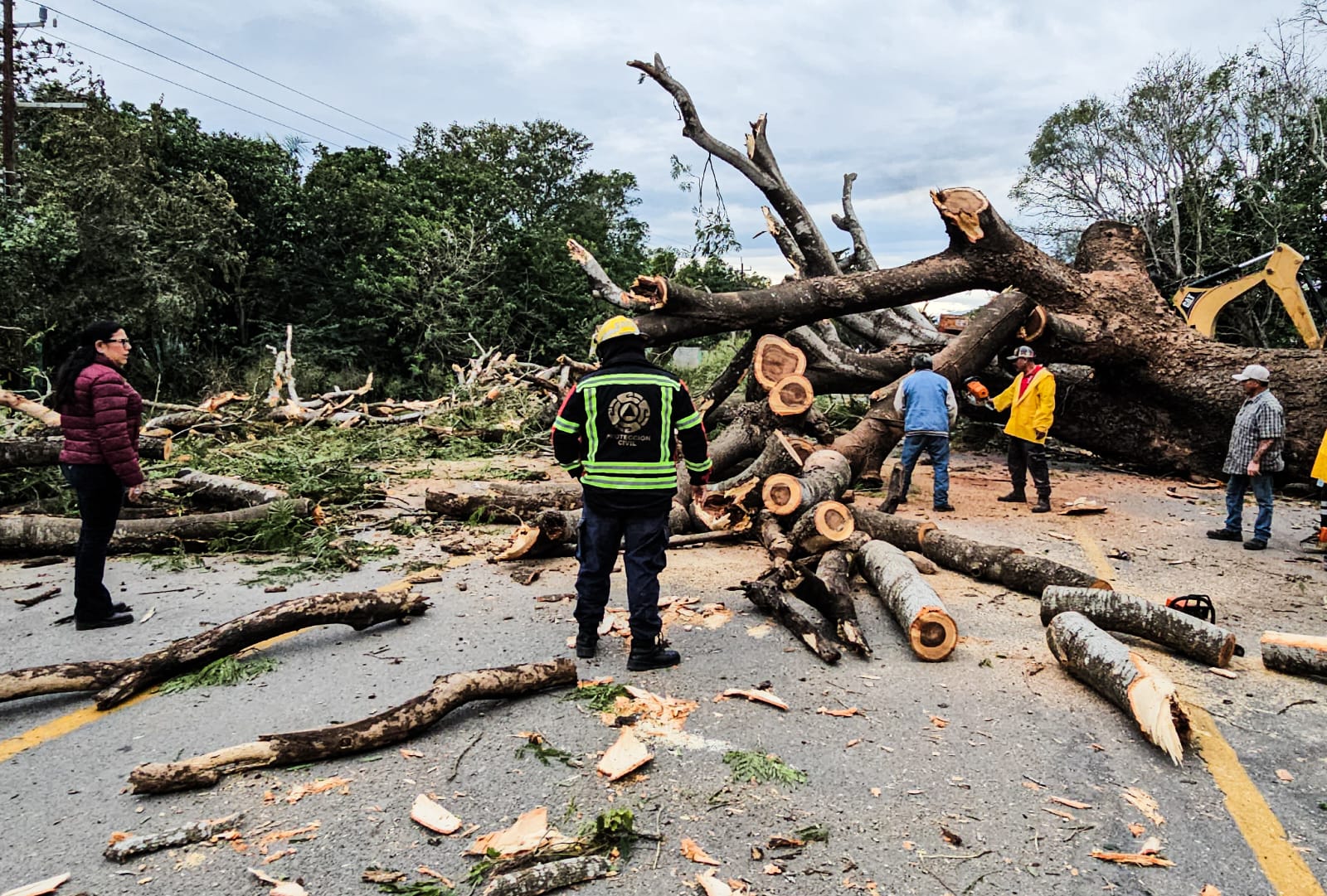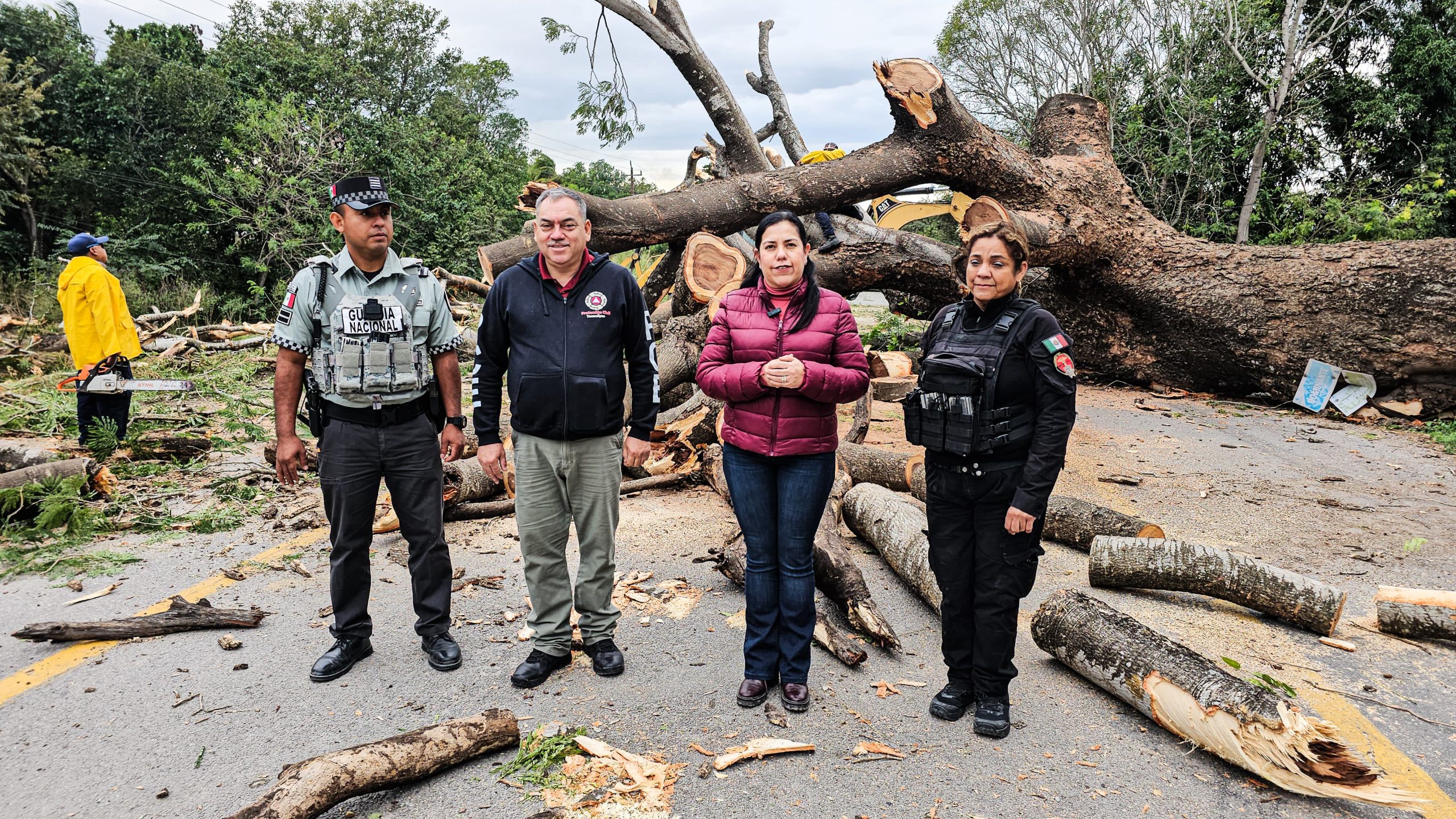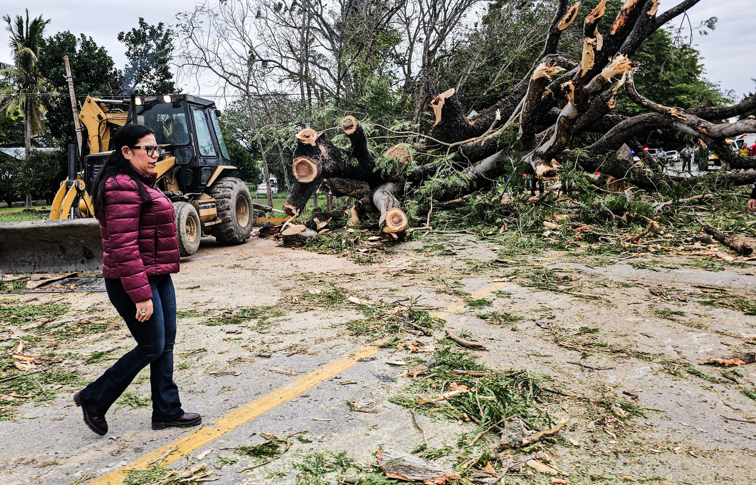 ​La alcaldesa Patty Chío acudió personalmente al kilómetro 108+500 de la carretera Mante-Victoria, donde se registró la caída de un árbol de grandes dimensiones que bloqueaba la circulación. Gracias a las labores intensas iniciadas a las 11:00 horas, y tras un arduo trabajo que concluyó a las 17:45 horas, se logró el retiro total de los escombros, restableciendo el flujo vehicular de manera segura.