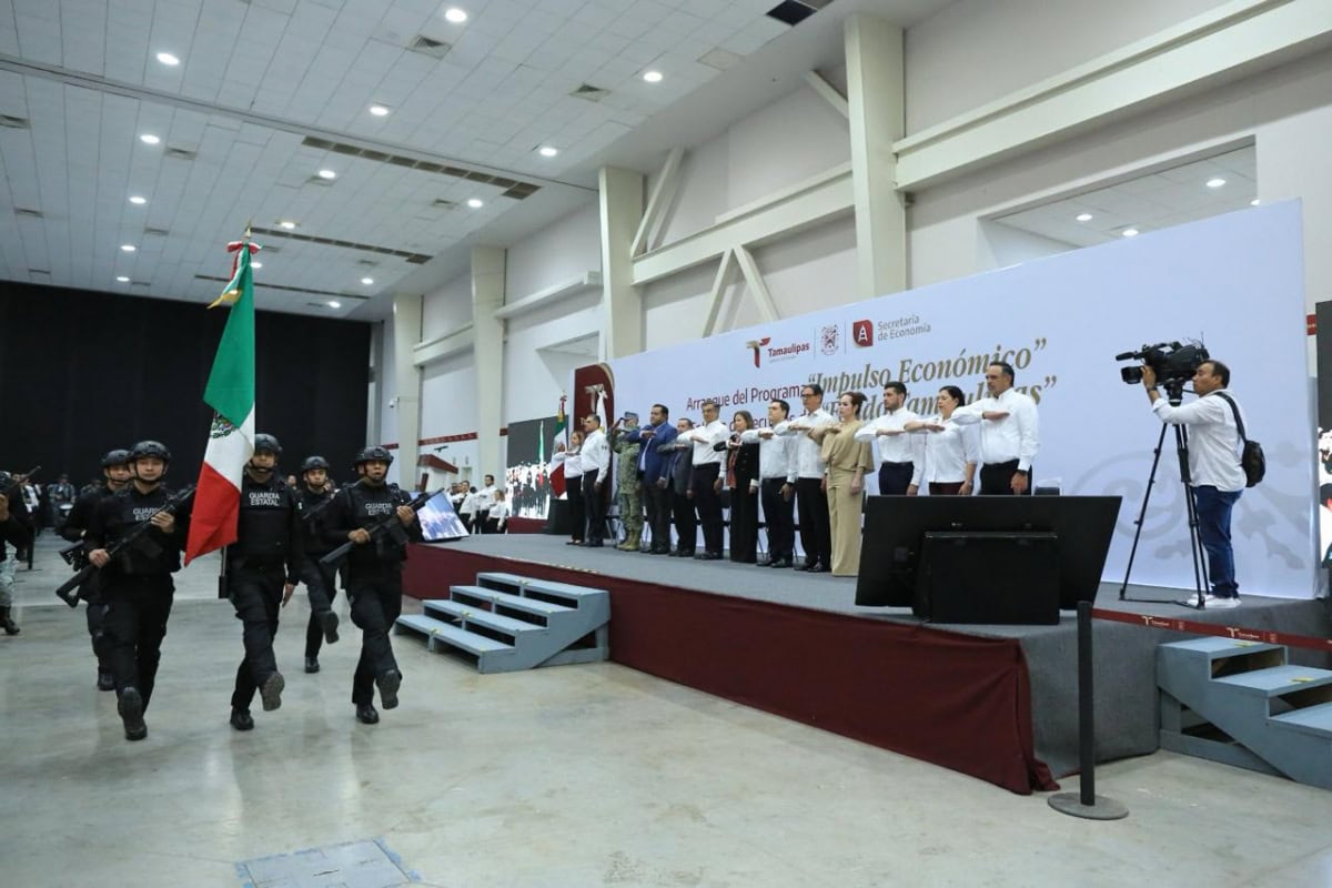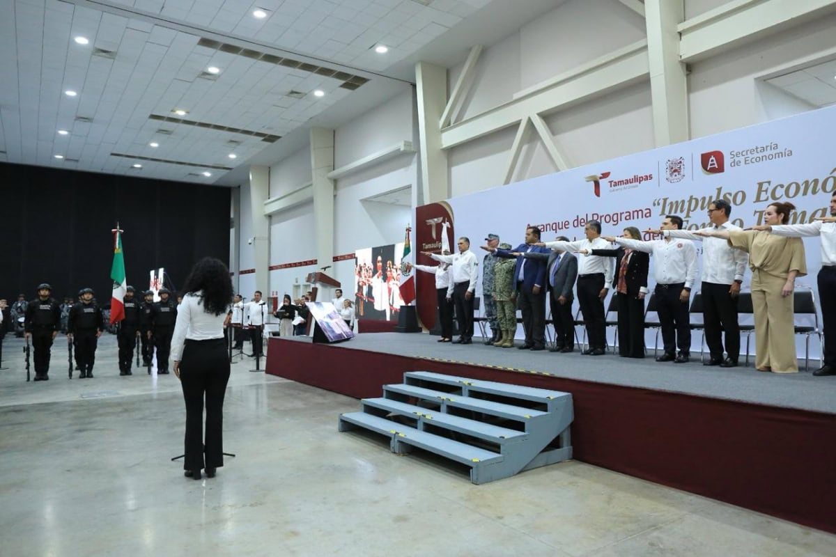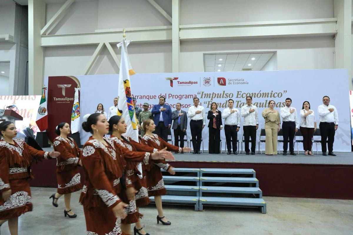 Durante la ceremonia de honores a la bandera, este lunes, en el Polyforum de esta capital, el gobernador entregó de manera simbólica recursos a cinco grupos de beneficiarios de los Programas Microcrédito, Microemprendedor y Credi Bienestar, de los municipios de Jiménez, Jaumave, San Fernando, Victoria y del SIPRODDIS y reconoció el apoyo de Nacional Financiera (NAFIN) para beneficiar a los emprendedores para que puedan acceder a créditos con tasas preferenciales, lo que permite apuntalar uno de los objetivos del Plan México que se refiere precisamente al financiamiento a micro, pequeñas y medianas empresas.