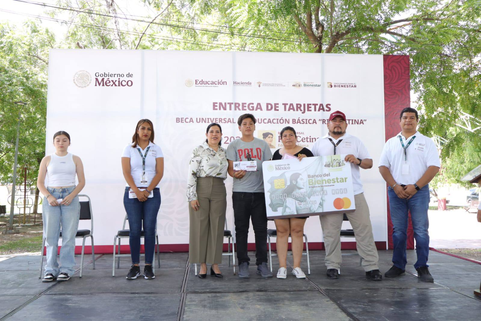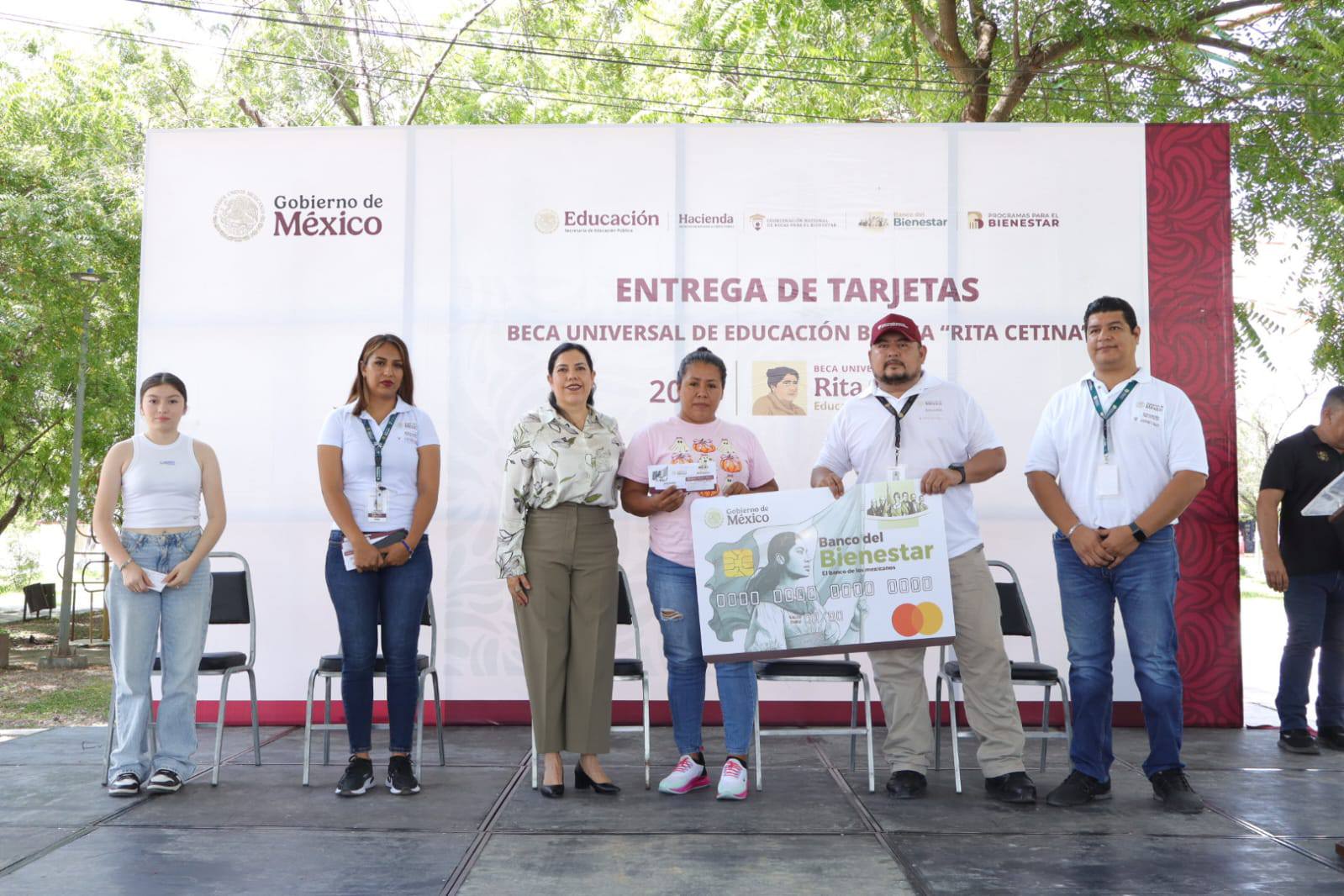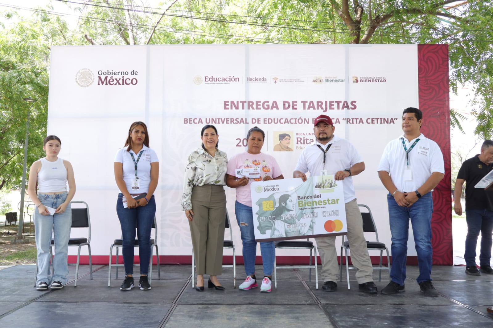 Al contar con la presencia del personal de la Coordinación de Becas del Bienestar, esta mañana la Presidenta Municipal Patty Chío hizo entrega de tarjetas para el cobro de las becas «Rita Cetina» y «Benito Juárez», pendientes por completar el tramite correspondiente al ciclo escolar 2024-2025.
