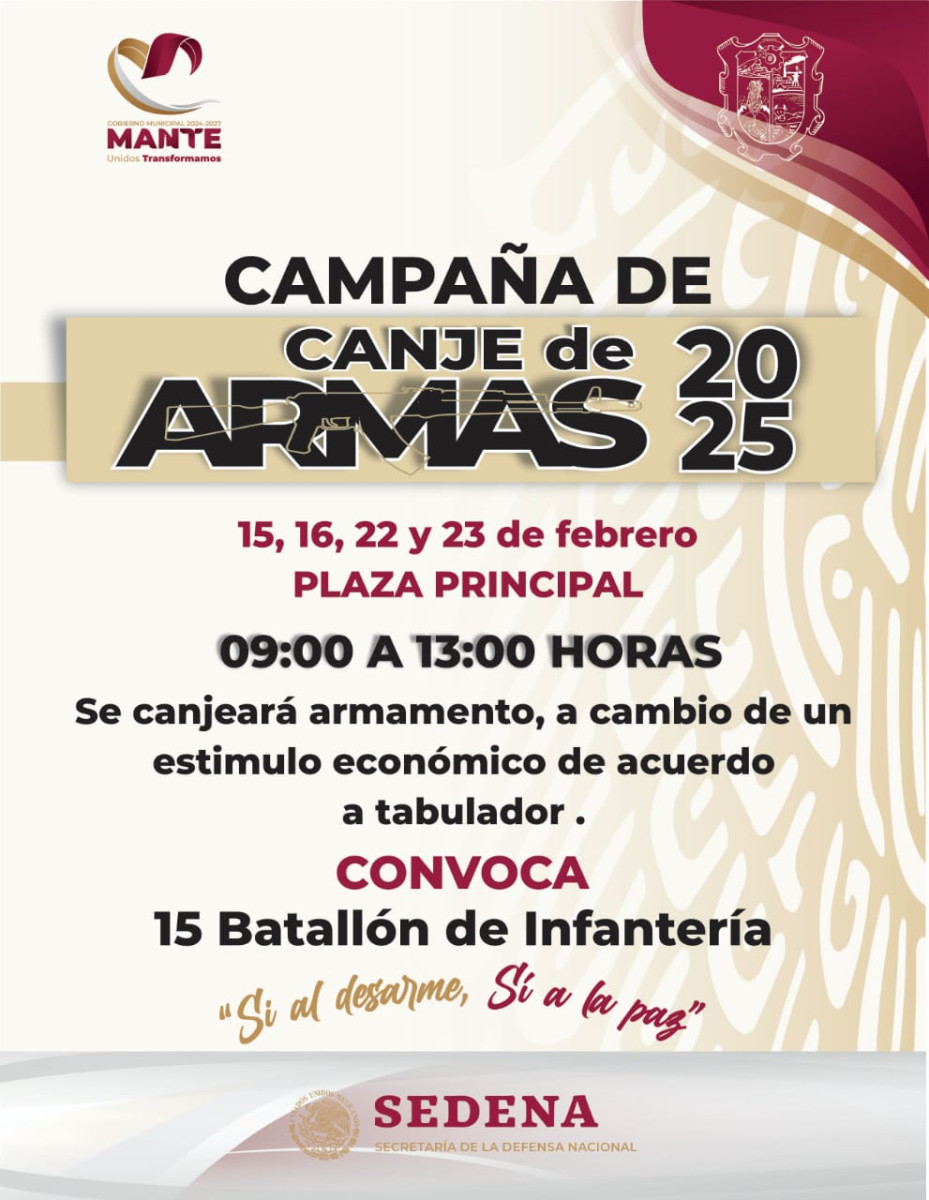 En una labor interinstitucional con el 15 avo batallón de Infantería, el Gobierno Municipal de El Mante, convoca a la sociedad a participar en la campaña de canje de armas por incentivo económico.