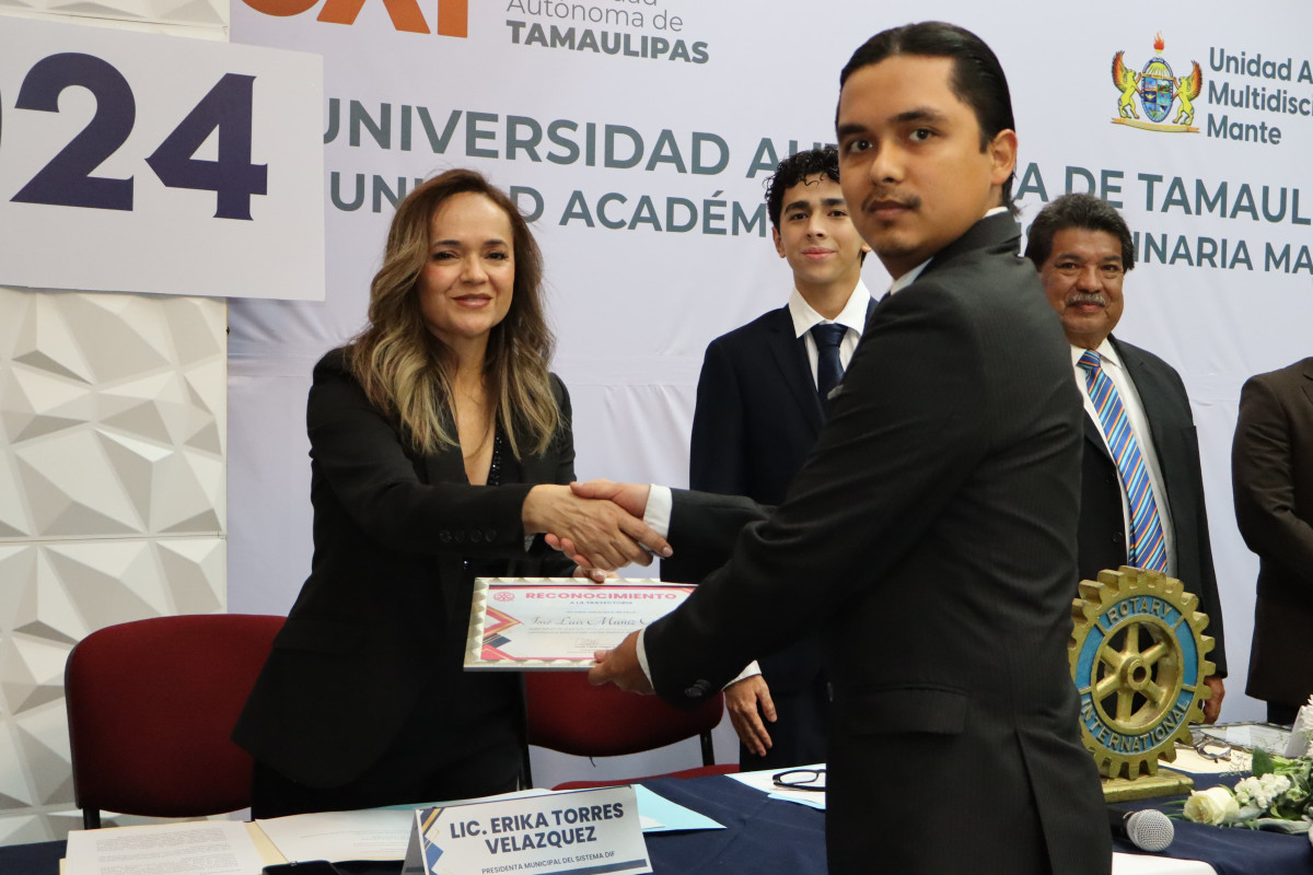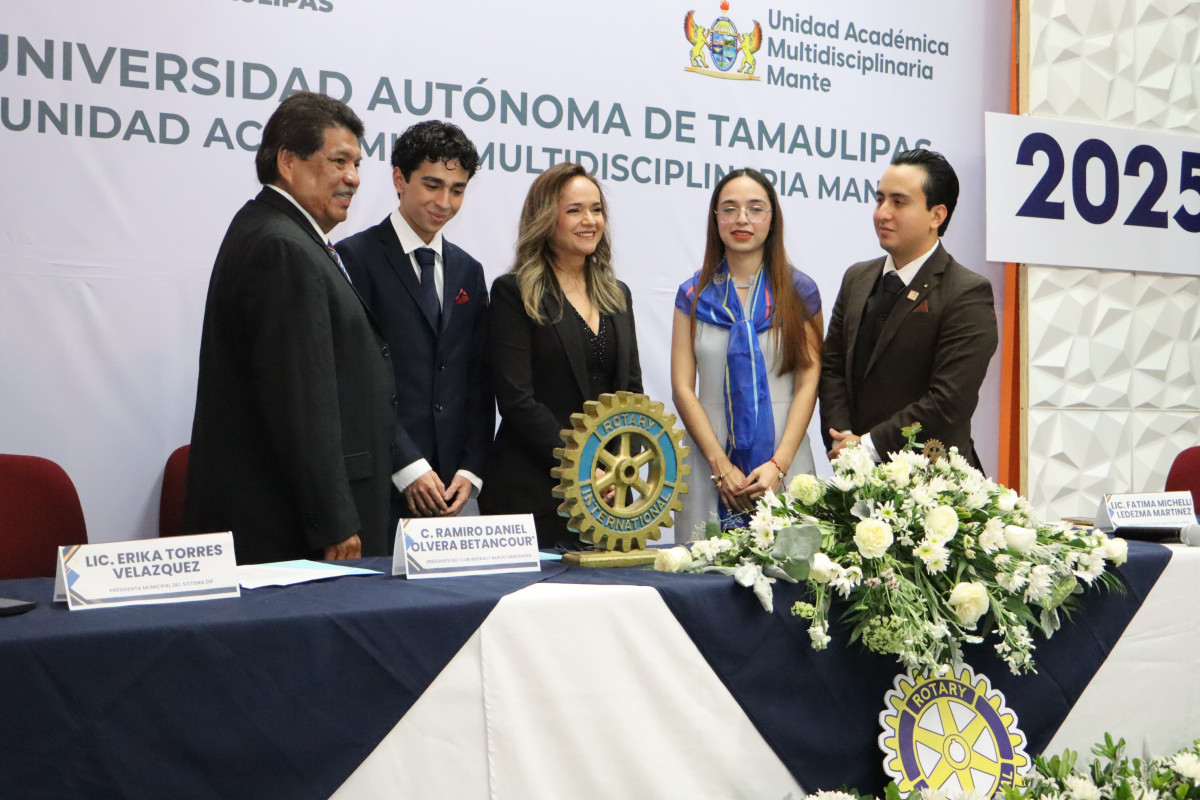 Junto al Presidente del club Rotario Mante Arq. Luis Alberto Cruz Colunga y a José Félix Vega Infante asesor de ambos clubes, Erika Torres Velázquez invitó a los jóvenes a nunca perder el entusiasmo y la disponibilidad por emprender acciones en atención a las causas sociales de la mano de la sociedad y del gobierno.