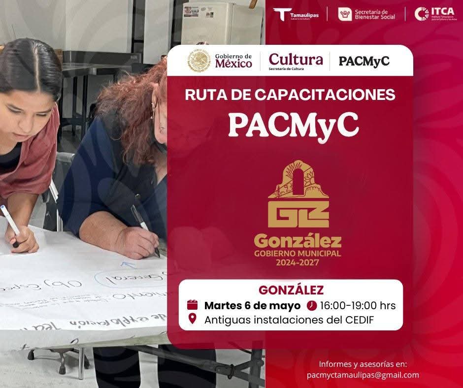 CD. GONZÁLEZ, TAMPS. – Como resultado de las gestiones impulsadas por el Presidente Municipal, Dr. Miguel Alejandro Zúñiga Rodríguez y el amplio respaldo del Gobernador de Tamaulipas Dr. Américo Villarreal, el Gobierno de González invita a toda la comunidad artística y cultural al Taller Gratuito de Elaboración de Proyectos Culturales Comunitarios PACMYC 2025.