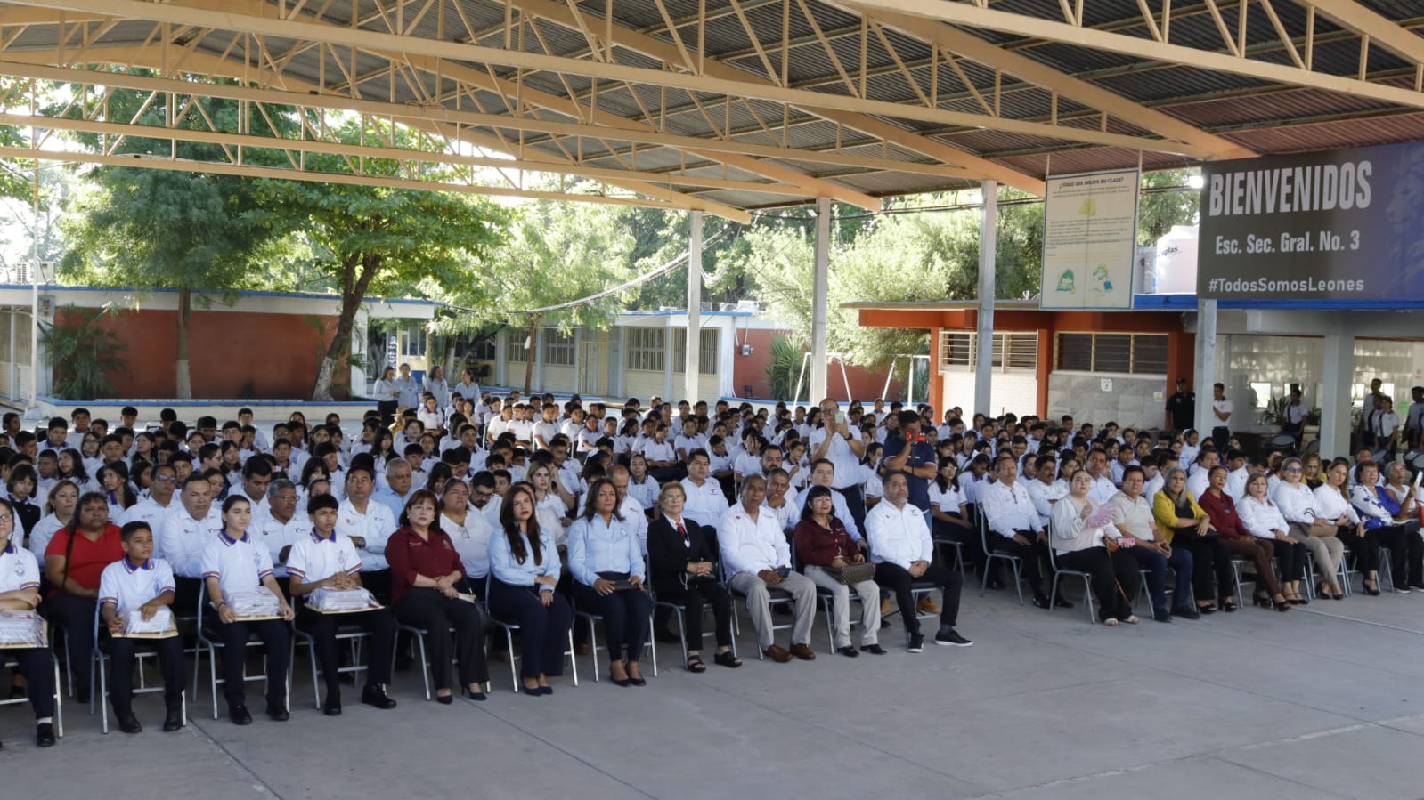 Con la presencia de la representante del Gobernador Américo Villarreal Anaya, Anabel Flores Garza Subsecretaria de Inversión de la Secretaría de Economía del Gobierno de Tamaulipas, la Presidenta Patty Chío puso en marcha el ciclo escolar en la Escuela Secundaria General No 3. Juan Camacho Cervantes.