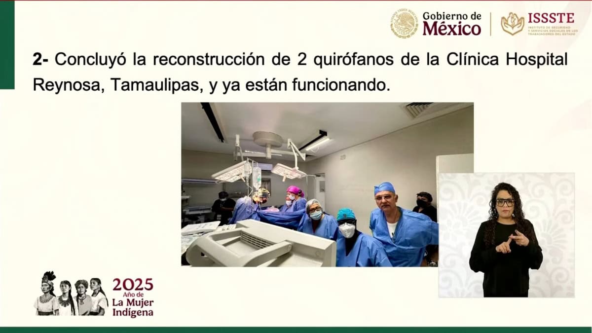 Durante la conferencia de este día, también se dio a conocer, por parte de Martí Batres, director general del ISSSTE, la conclusión de la reconstrucción de dos quirófanos de la Clínica-Hospital de Reynosa, Tamaulipas, los cuales ya están trabajando al cien por ciento.