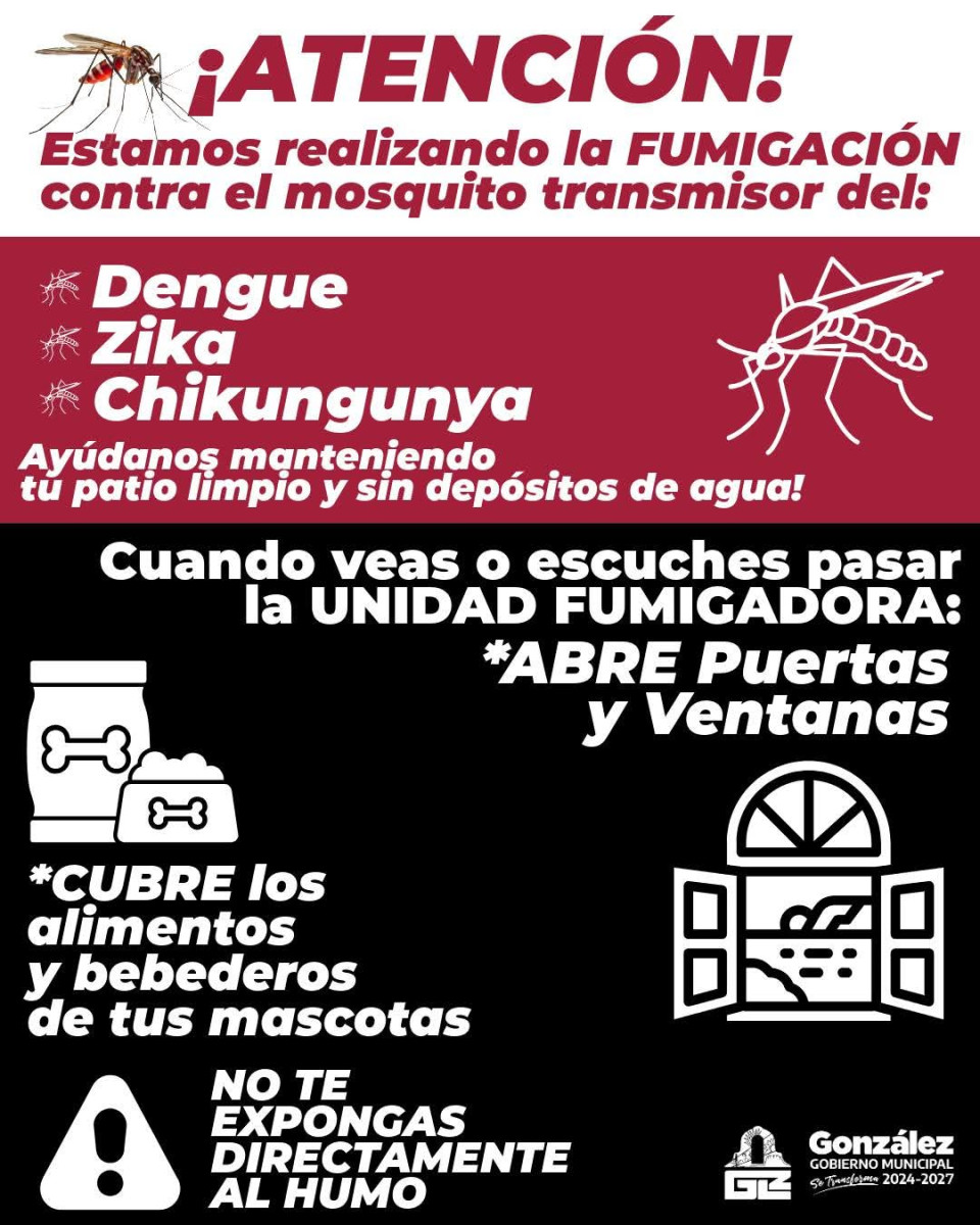 González,Tam.-El gobierno de González que preside el presidente Miguel Zuñiga ha comenzado la fumigación preventiva en todo el municipio contra el mosquito transmisor del Dengue, Zika y Chikungunya