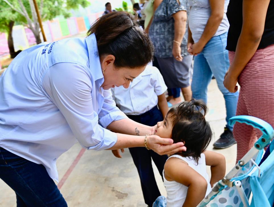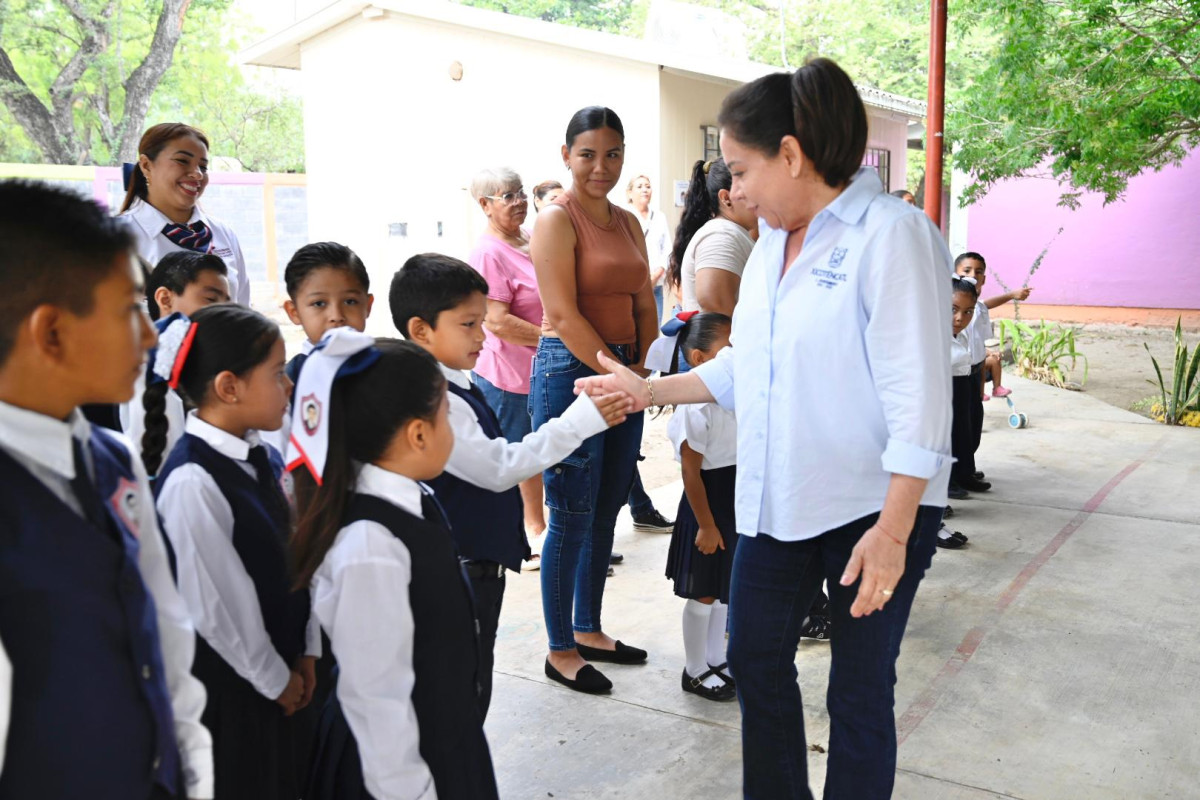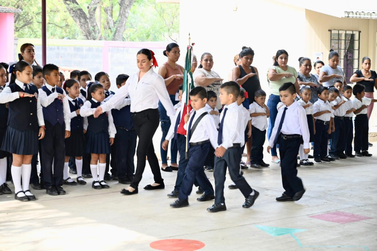 Acompañada por la presidenta del Sistema DIF municipal, Marla García López, la alcaldesa participó en los honores a la Bandera Nacional, en un acto que congregó a autoridades educativas, padres de familia y miembros de la comunidad ejidal.