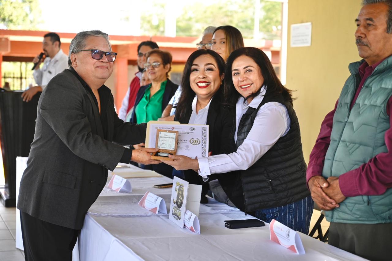 Durante el acto, la alcaldesa reconoció la trayectoria y vocación de dos docentes, a quienes hizo entrega de reconocimientos y medallas por 25 años de servicio dentro del Sistema de Educación Pública, distinciones otorgadas por la DGETI, en agradecimiento a su invaluable labor formativa.