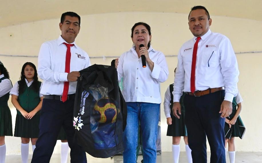Durante su visita entregó material deportivo y supervisó labores de limpieza y mantenimiento, instruyendo al personal de servicios generales y de COMAPA para asegurar instalaciones dignas y funcionales para la comunidad escolar.