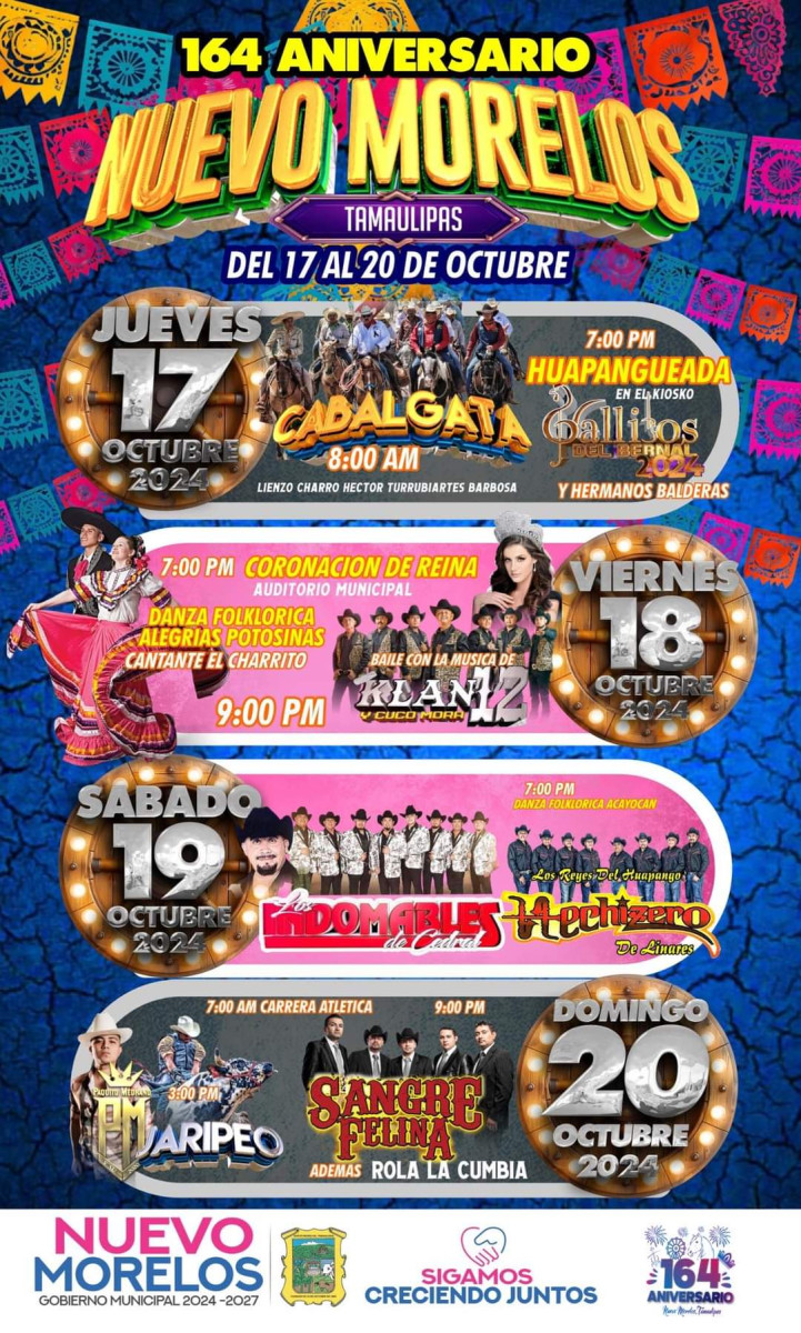 El Ayuntamiento de Nuevo Morelos, bajo la dirección de la Alcaldesa Yaneth Nájera y el H. Cabildo, invita a toda la comunidad a participar en las celebraciones del #164Aniversario de la fundación del municipio. Del 17 al 20 de octubre, los vecinos disfrutarán de una variada cartelera de eventos totalmente gratuitos, incluyendo una grandiosa cabalgata, la tradicional huapangueada, la coronación de la reina, una emocionante carrera atlética y un espectacular jaripeo.