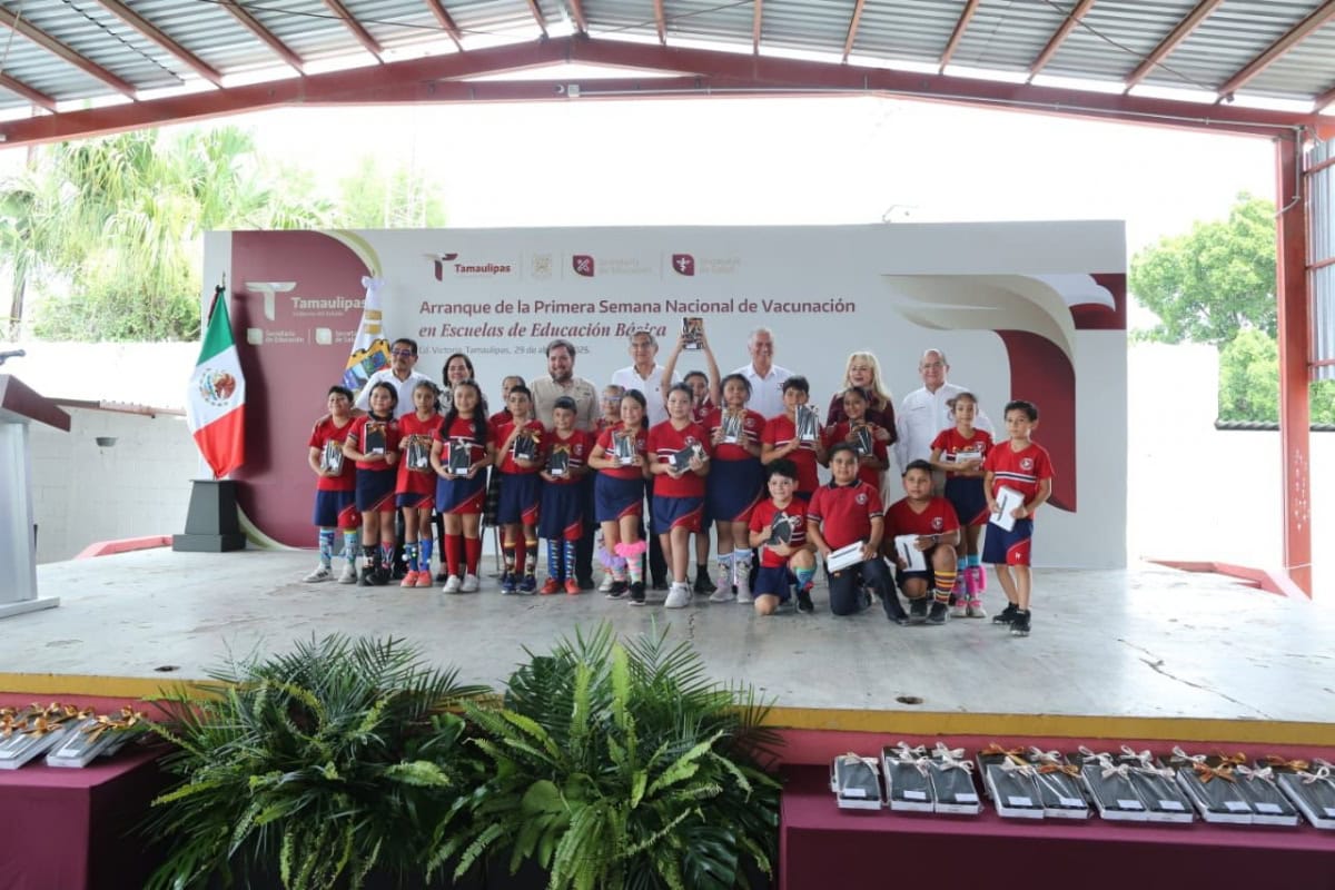Ciudad Victoria, Tamaulipas. – Al poner en marcha la primera Semana Nacional de Vacunación en escuelas de educación básica y tras cumplir un compromiso que hizo hace pocas semanas de entregar dispositivos informáticos móviles a estudiantes de la escuela primaria “Felipe Pescador”, el gobernador Américo Villarreal Anaya aseguró que las niñas y los niños son la felicidad presente de Tamaulipas y la felicidad de una nueva sociedad que busca un futuro de bienestar con una visión humanista.