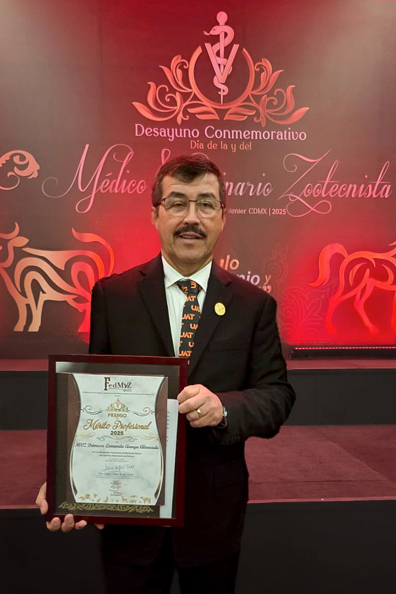 El Premio al Mérito Profesional 2025, es considerado una de las distinciones más altas otorgadas por la FedMVZ, la máxima organización gremial que representa a las médicas y médicos veterinarios zootecnistas de México a nivel nacional e internacional. Dámaso Anaya Alvarado es médico veterinario zootecnista por la UAT, cuenta con las maestrías en Producción Animal y en Administración de Empresas Agropecuarias; en su trayectoria se ha desempeñado como profesor en la UAT, impartiendo clases de Nutrición Animal, contribuyendo al fortalecimiento académico y profesional de numerosas generaciones de estudiantes.