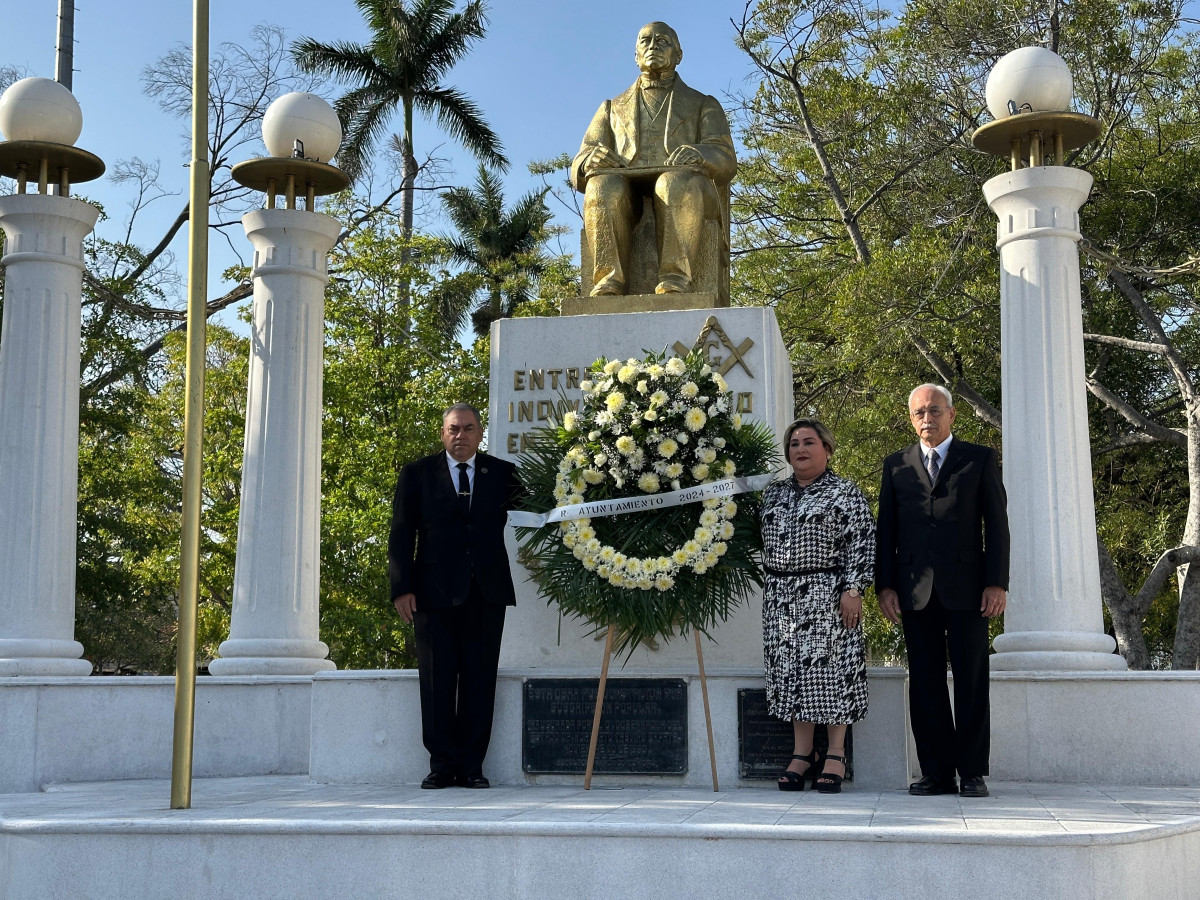 Se izo la bandera y junto a logias masónicas se depositó ofrenda florar en el emiciclo a Juárez.