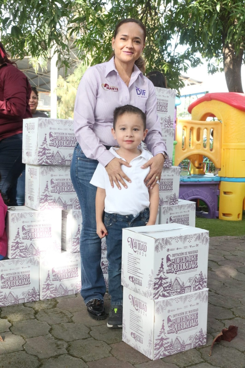 Niños y niñas mantenses que se alimentan con los desayunos escolares del sistema DIF Tamaulipas, recibieron su dotación de navidad.
