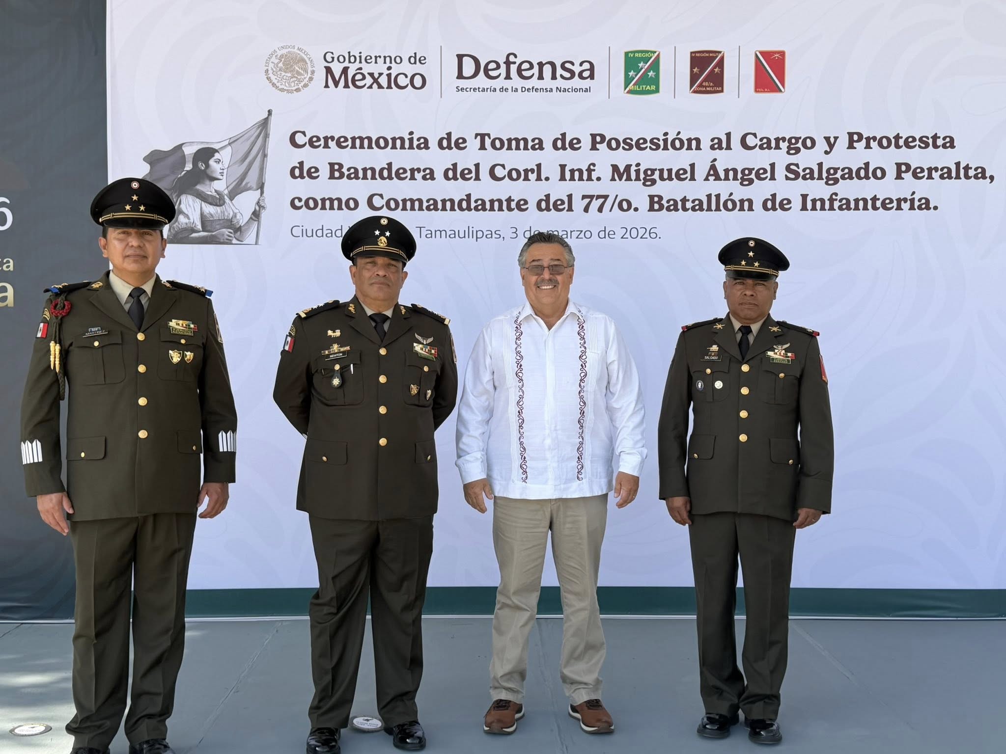 Tula,Tam.-El alcalde de Tula, René Lara Cisneros, asistió a la Toma de Posesión y Protesta de Bandera del nuevo comandante del 77/o. Batallón de Infantería, en un acto solemne que reafirma el compromiso con la lealtad, el honor y el servicio a la patria.