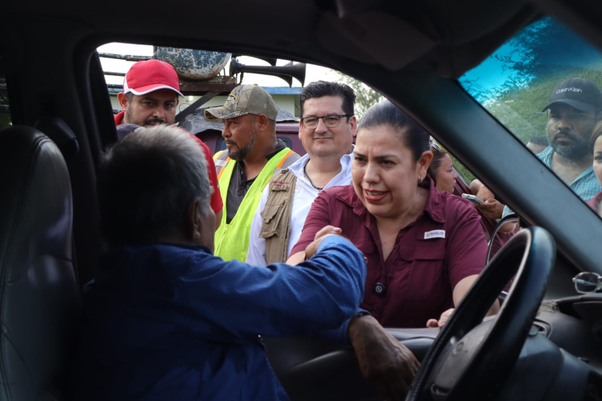 río Guayalejo en Tantoyuquita, la Presidenta Municipal Patty Chío supervisó la comunidad solidarizandose con la entrega de apoyo alimentario a familias afectadas.