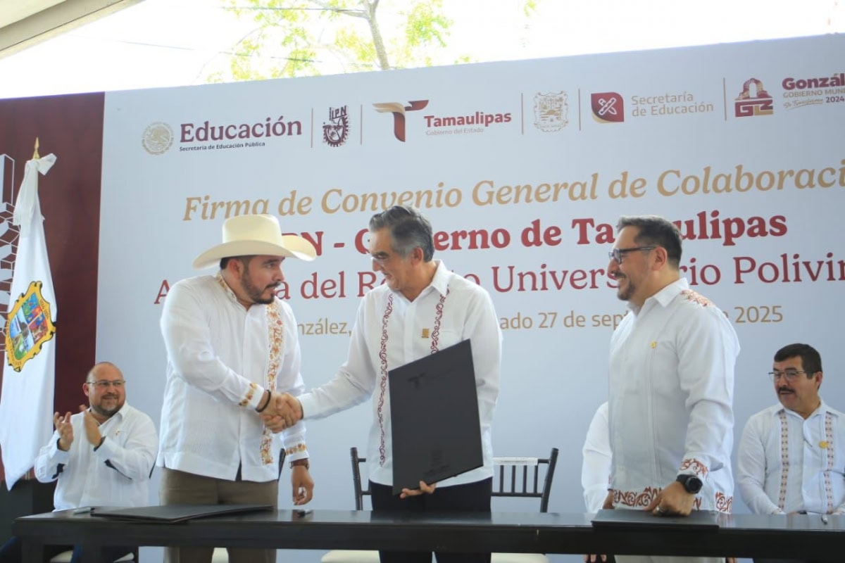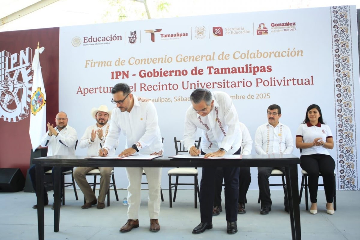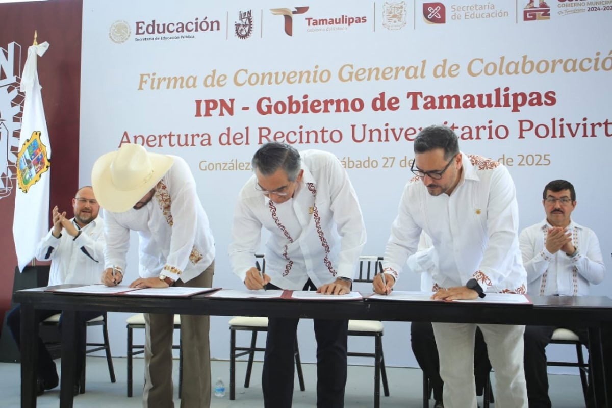 González, Tamaulipas. – El gobernador Américo Villarreal Anaya firmó el convenio de colaboración con el Instituto Politécnico Nacional e inauguró el Recinto Universitario Polivirtual, una nueva plataforma académica con la calidad y la excelencia educativa que distingue a esta prestigiada institución y que, por primera vez, se pone en marcha en todo el país.