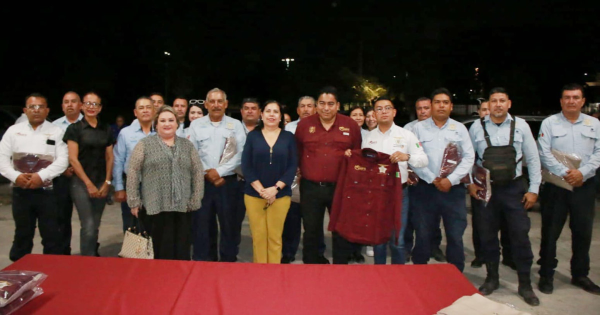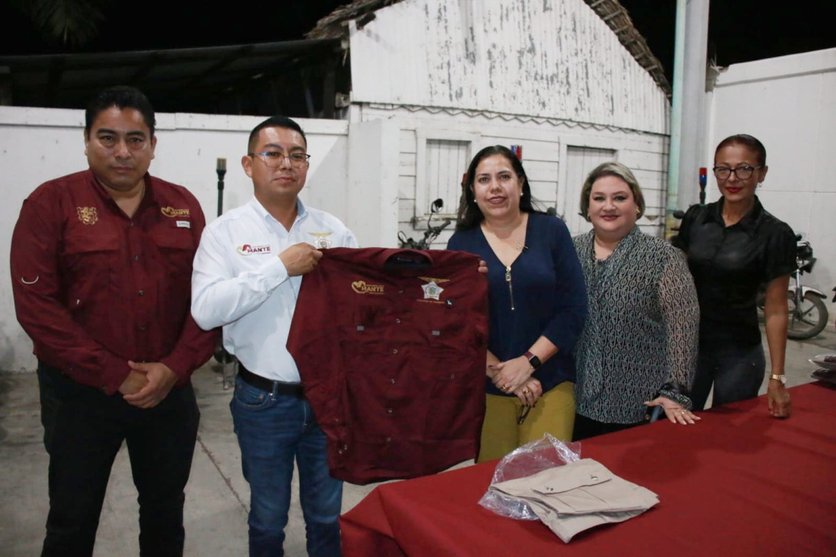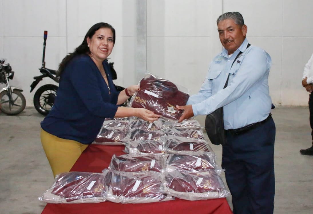 Acompañada por el Director de Tránsito Javier Díaz Hernández , la Presidenta Municipal Patty Chío entregó la nueva indumentaria que portan los elementos de vialidad.