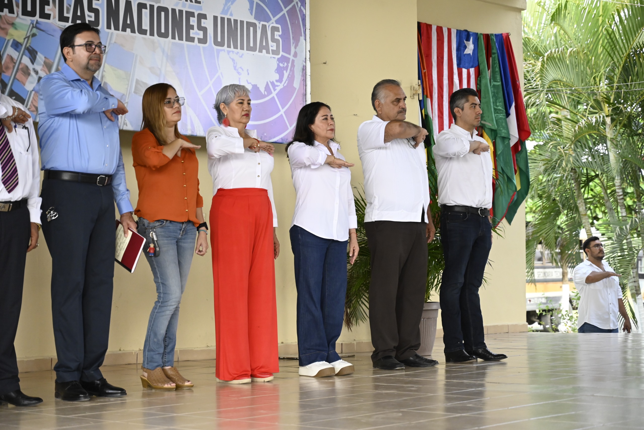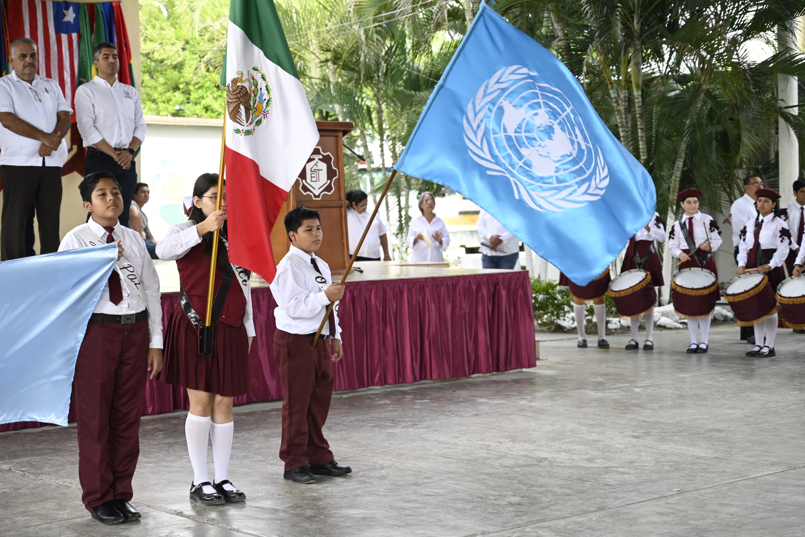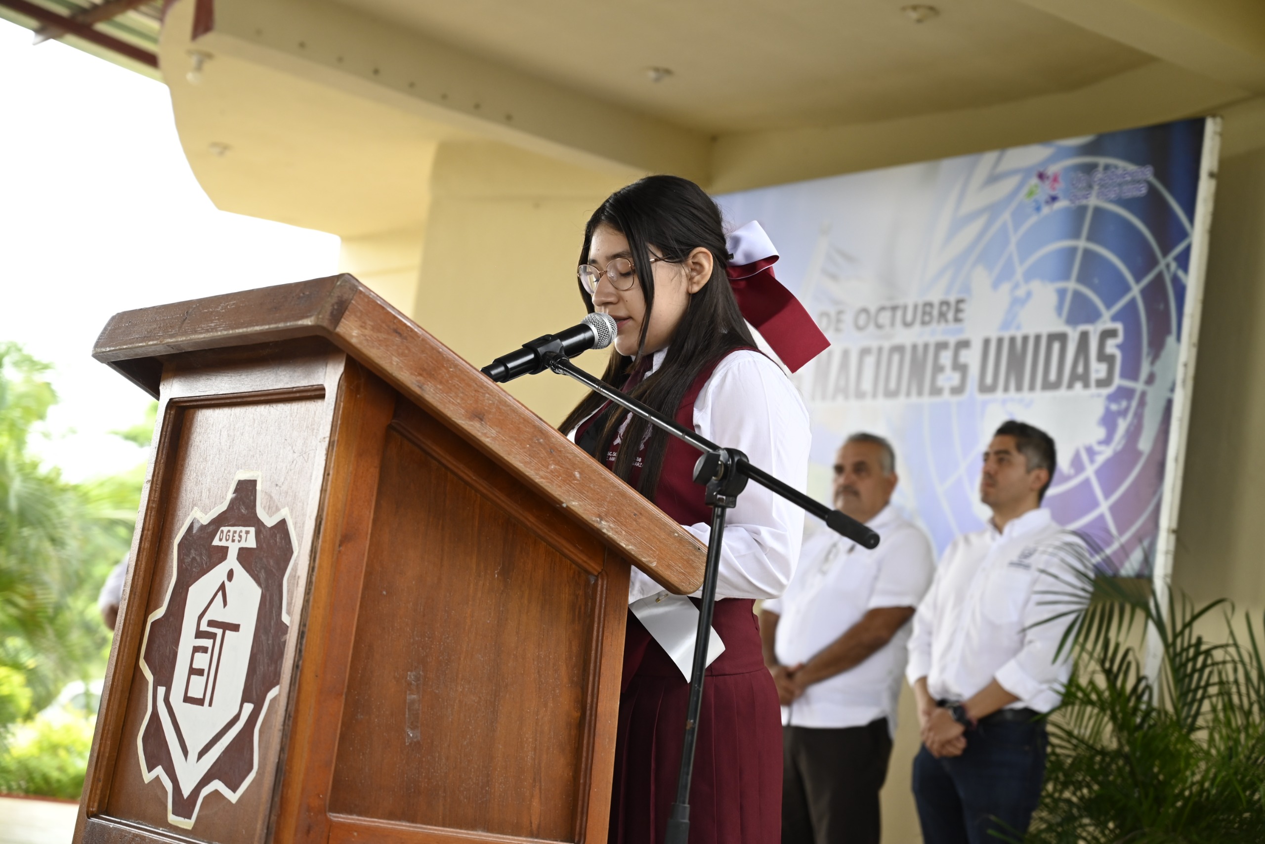 La presidenta municipal Mariela López Sosa encabezó la ceremonia conmemorativa por el Día de las Naciones Unidas en la Escuela Secundaria Técnica No. 38, donde se reafirmaron los valores de paz, unidad y cooperación internacional.