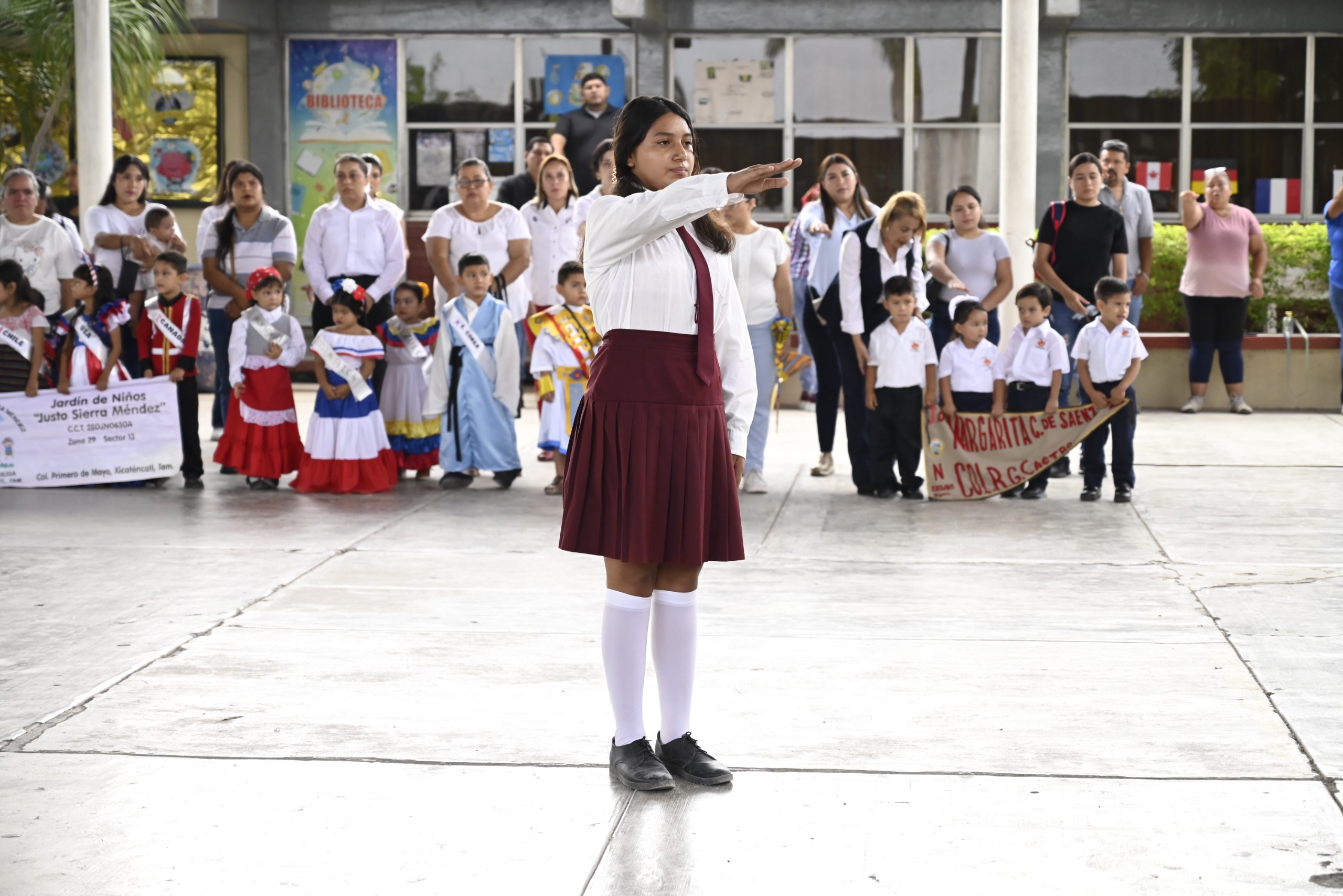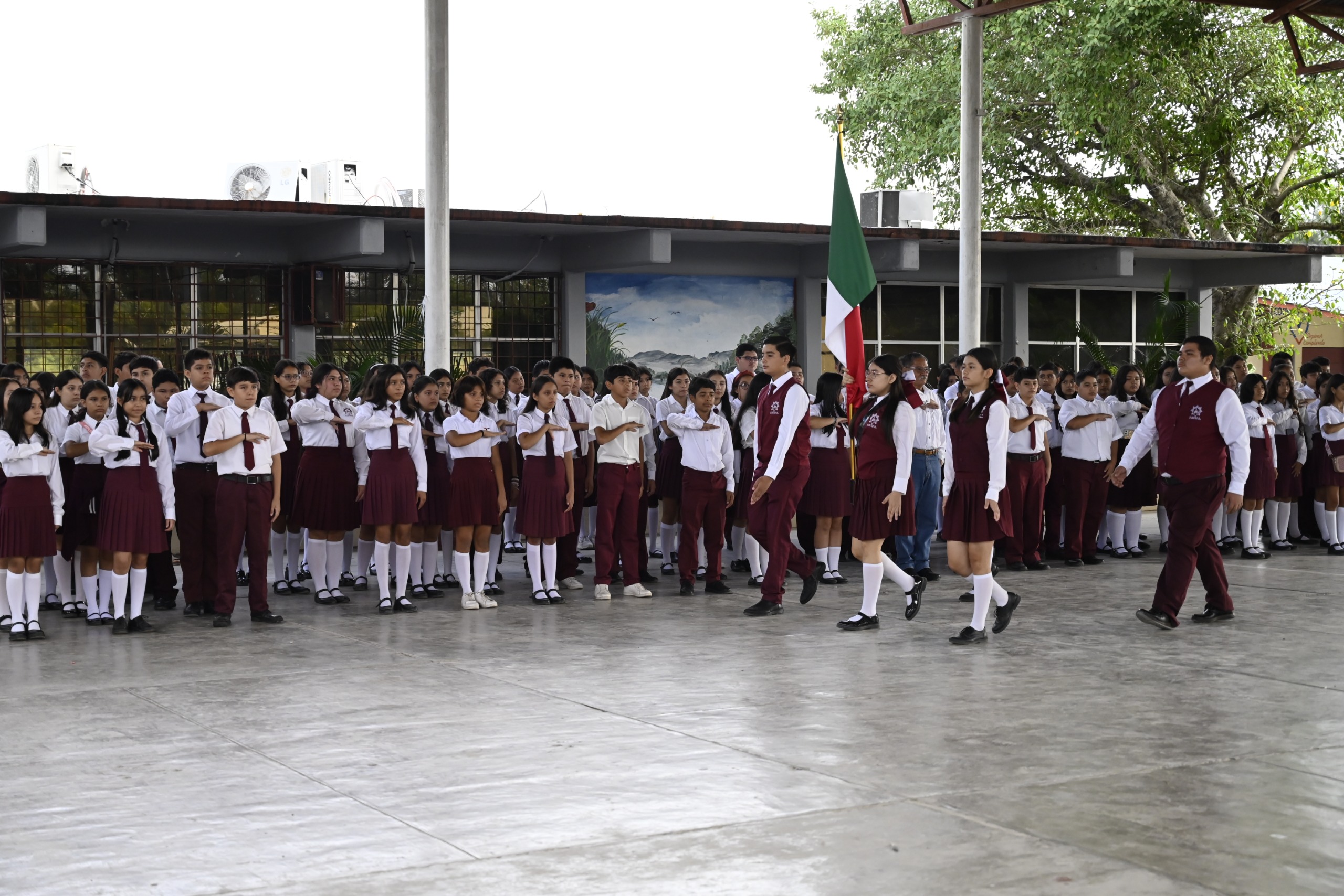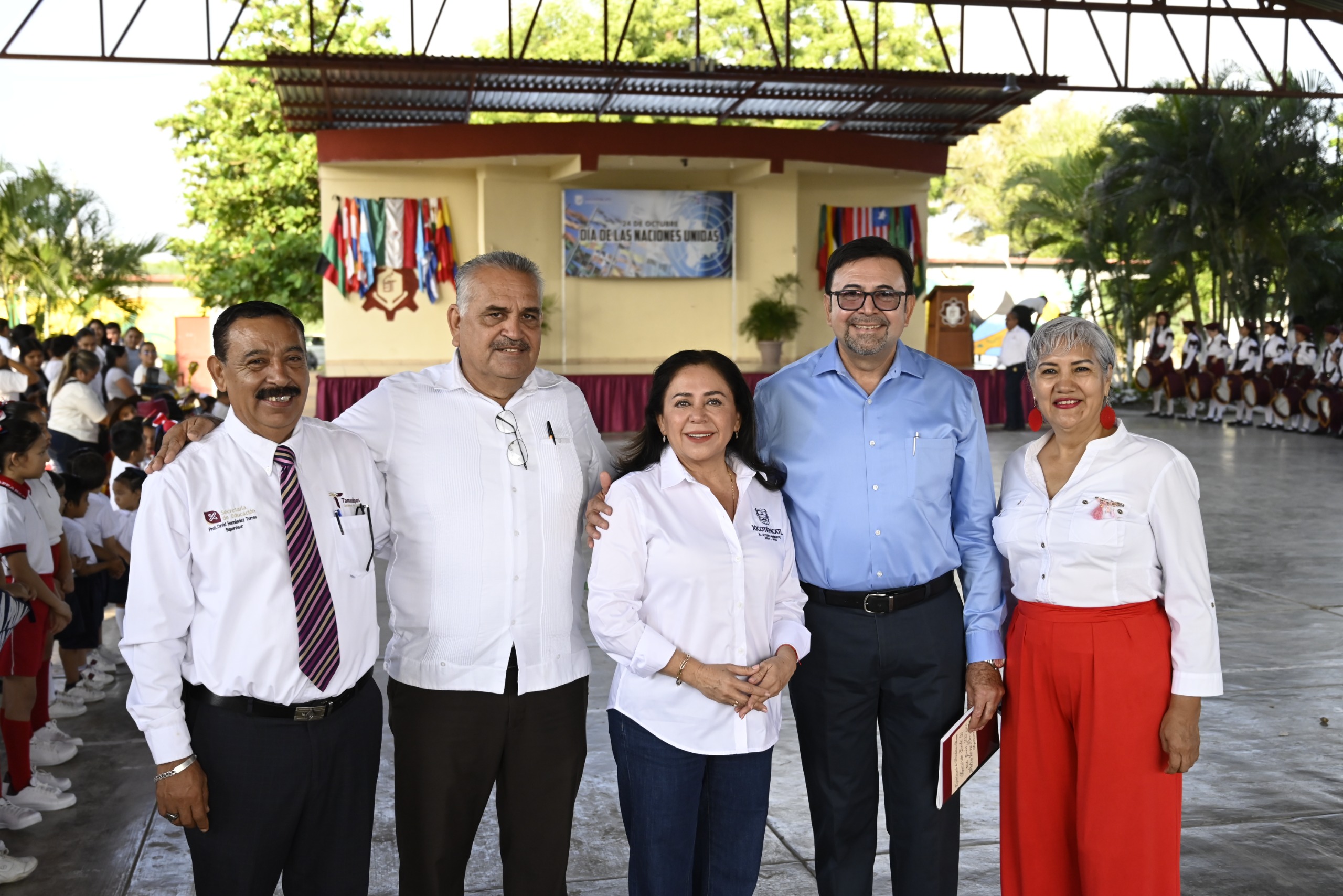 La presidenta municipal Mariela López Sosa encabezó la ceremonia conmemorativa por el Día de las Naciones Unidas en la Escuela Secundaria Técnica No. 38, donde se reafirmaron los valores de paz, unidad y cooperación internacional.