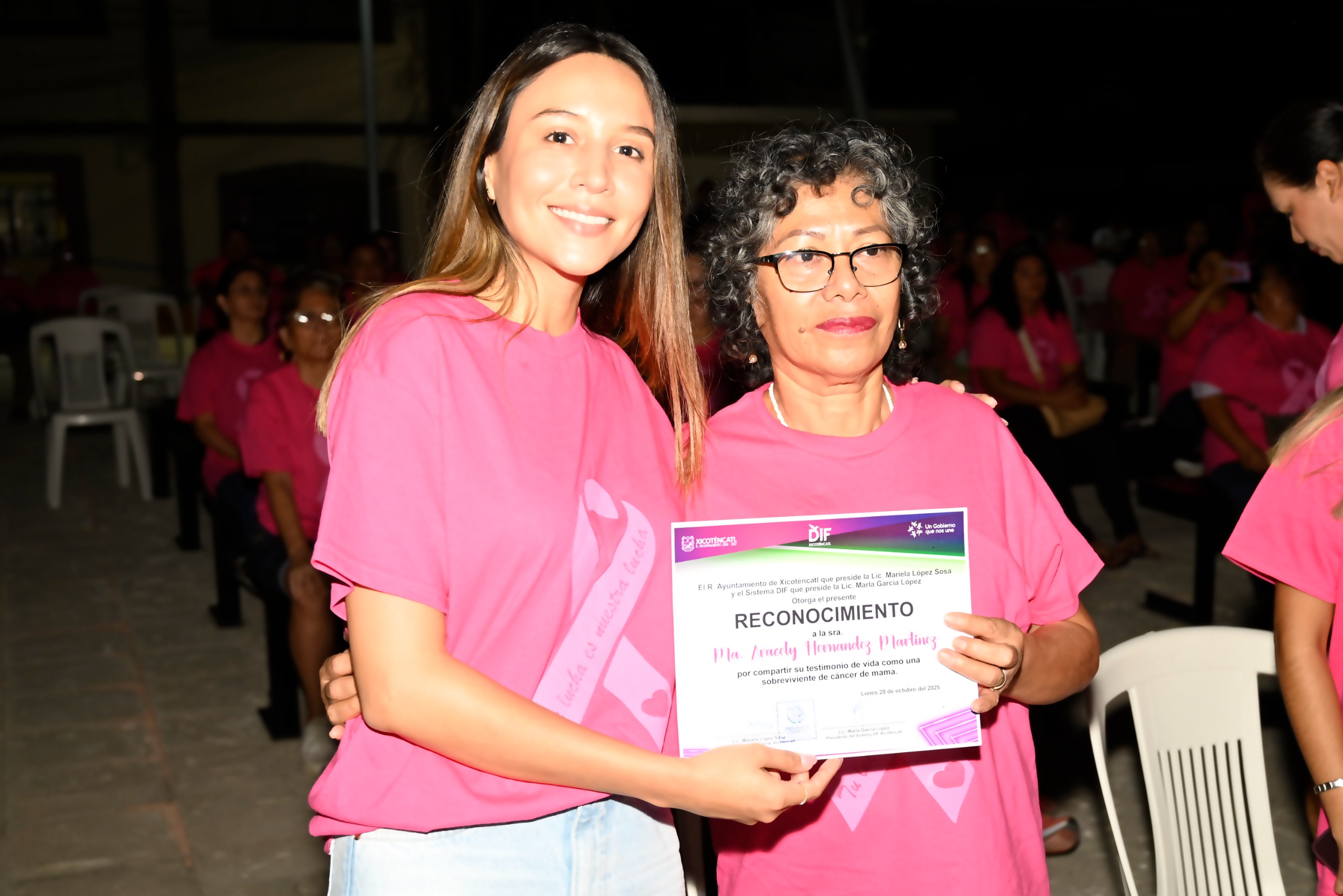 Durante el acto, la Sra. Aracely Hernández Martínez, sobreviviente de cáncer de mama, recibió un reconocimiento especial de manos de Marla García López, en honor a su valentía, resiliencia y testimonio de vida, ejemplo para toda la comunidad.